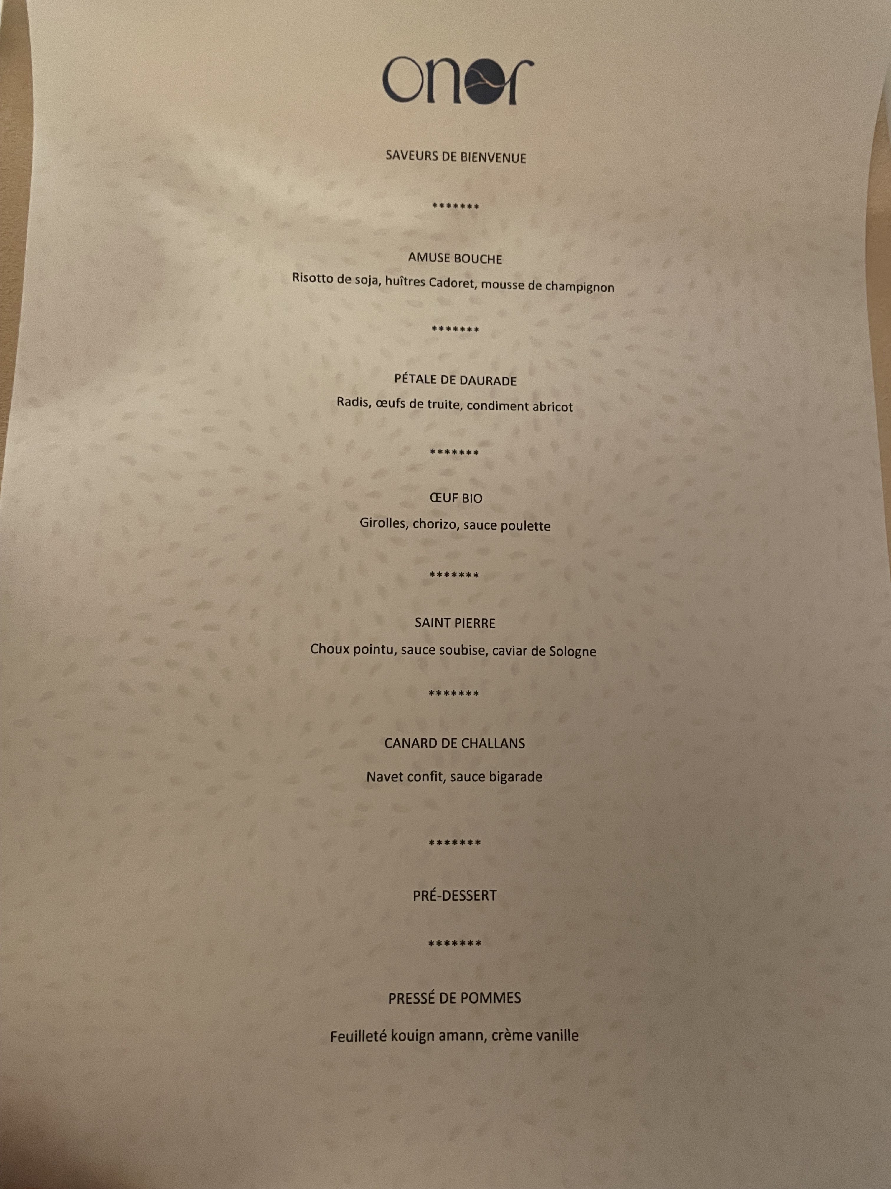 Une magnifique découverte, le dîner était excellent. Tout les plats étaient divins et l'équipe de ONOR est incroyable et aux petits soins pour nous. Un endroit où l'on se sent bien. Je recommande vivement ce lieu qui vaut le détour.