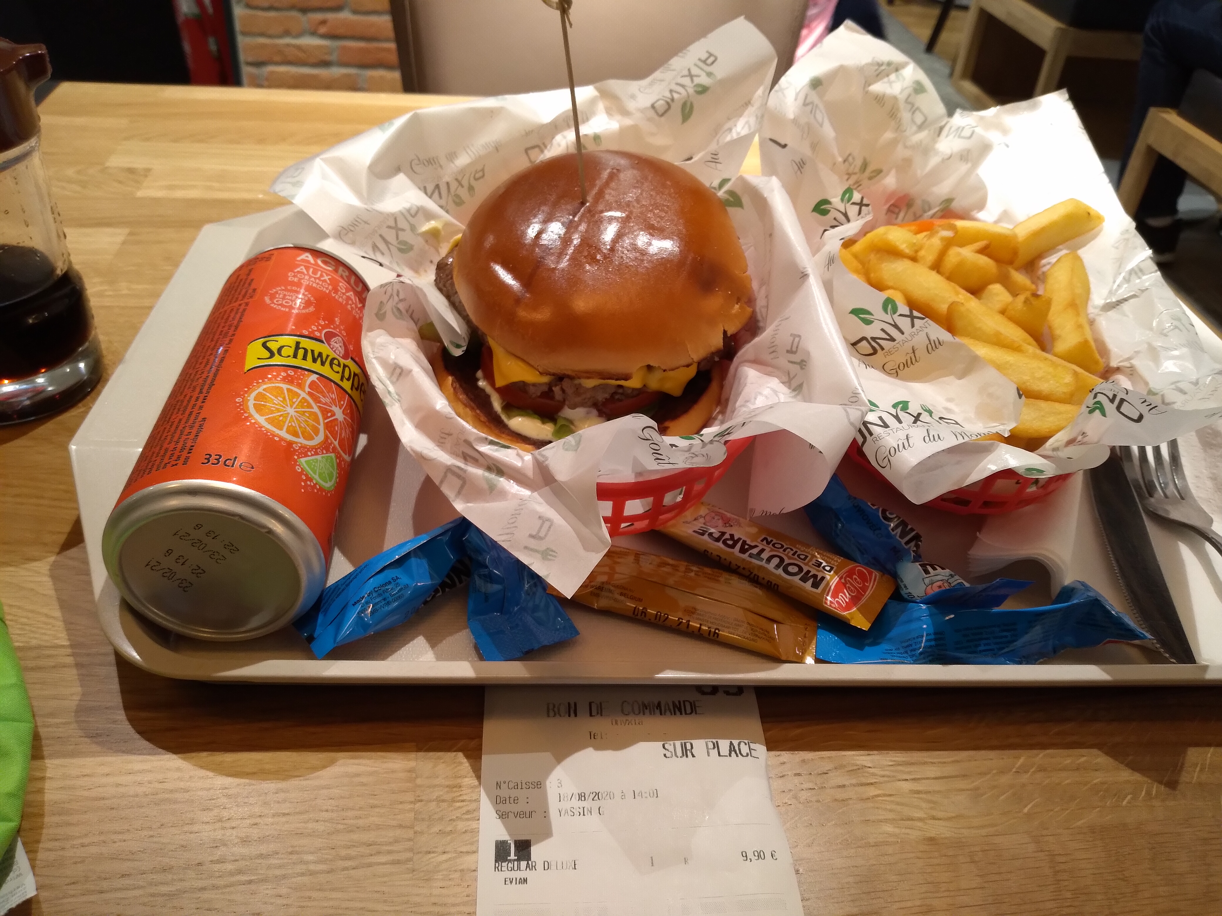 Très bon et les portions sont copieuses. Large choix de plats ce qui m'a surprise, j'ai même pensé que la qualité allait être impactée mais absolument pas, c'est très bon et la cuisson des viandes est top. En revanche, problèmes d'information quant au fonctionnement entre les bornes de commande et le guichet, si on ne connait pas le lieu on peut attendre longtemps avant d'avoir l'information. Et le lieu est un peu trop bruyant malheureusement.