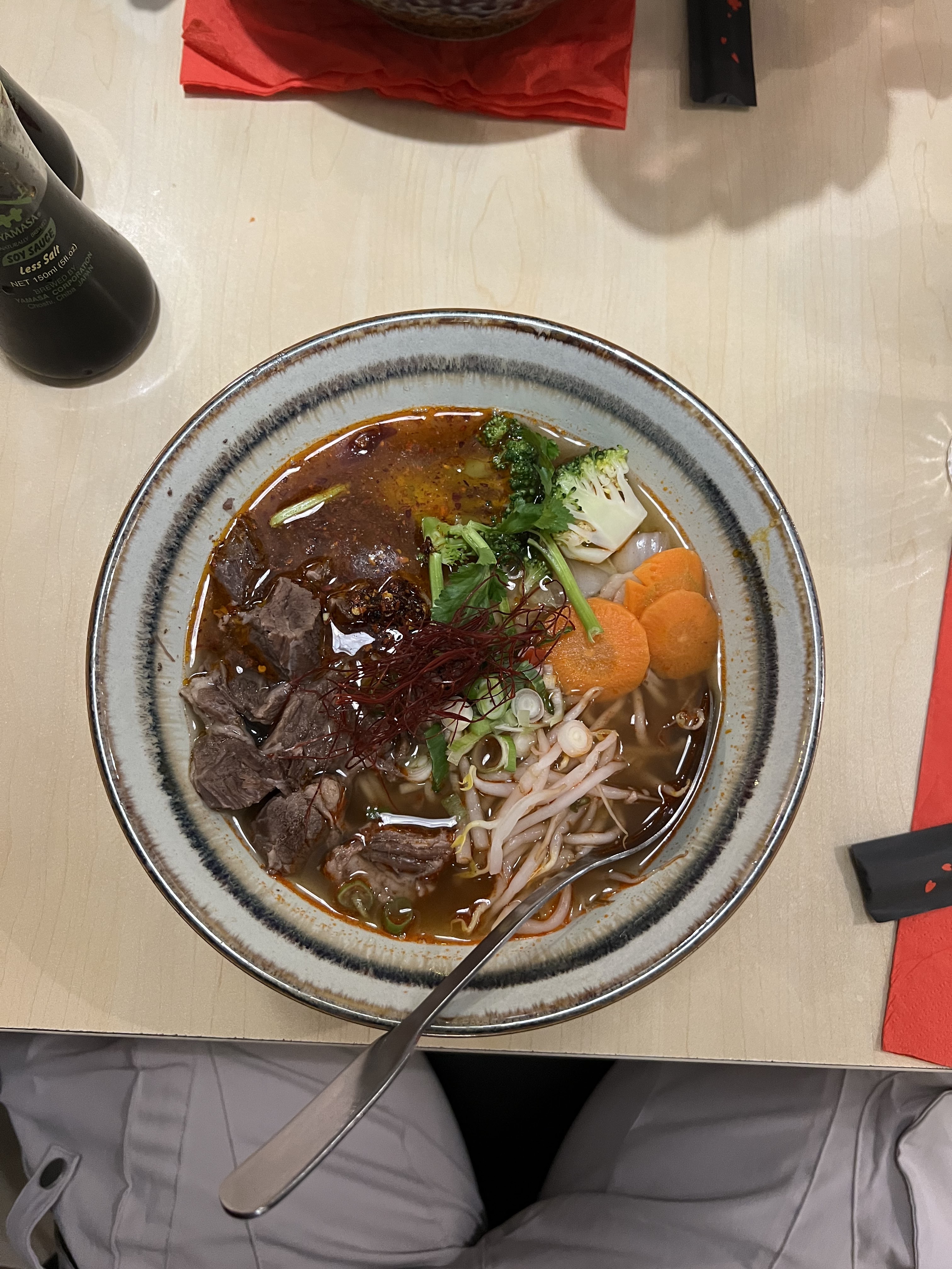 J'ai pris le ramen au bœuf, mais je ne l'ai pas aimé. Il y avait des pousses de soja et des carottes rapés comme légumes, mais quelque chose manquait dans le bouillon. Il y avait beaucoup trop de cannelle, ce qui donnait l'impression de manger un bouillon à la cannelle avec du bœuf.