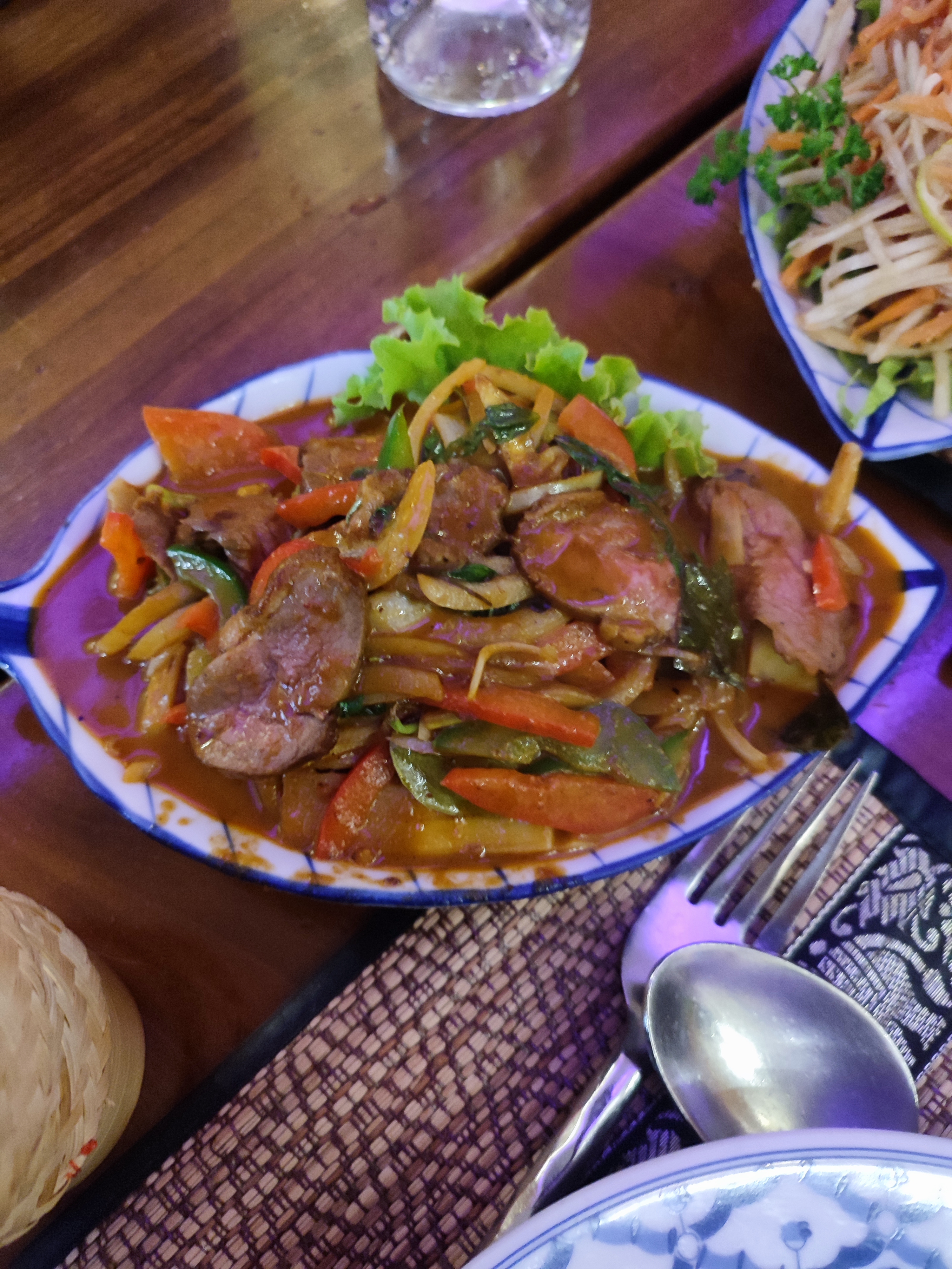 Le décor est très sympa, le personnel agréable et la nourriture excellente ! J’ai mangé une salade de bœuf mariné en entrée, du poulet au curry rouge en plat accompagné de riz gluant et un flan coco, je me suis régalée 👍🏻