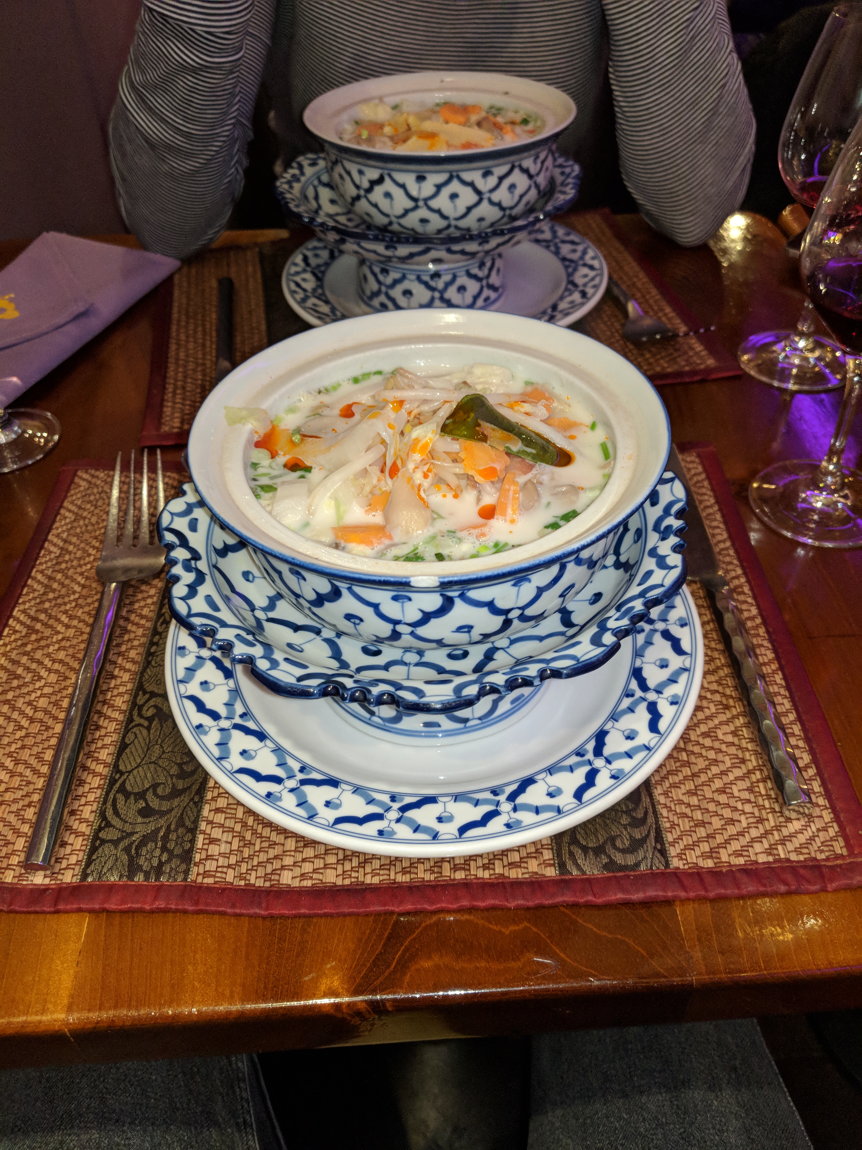 Nous avons pris une soupe de poulet et un poulet épicé, et deux flans thaïlandais en dessert. Tout était excellent et rapidement servi malgré le monde. Je me suis régalée. La pépite de ce dîner restait quand même le service. Chaleureux, efficace, gentil, tout y était. Je reviendrai à coup sûr !! Merci pour cette soirée 😊