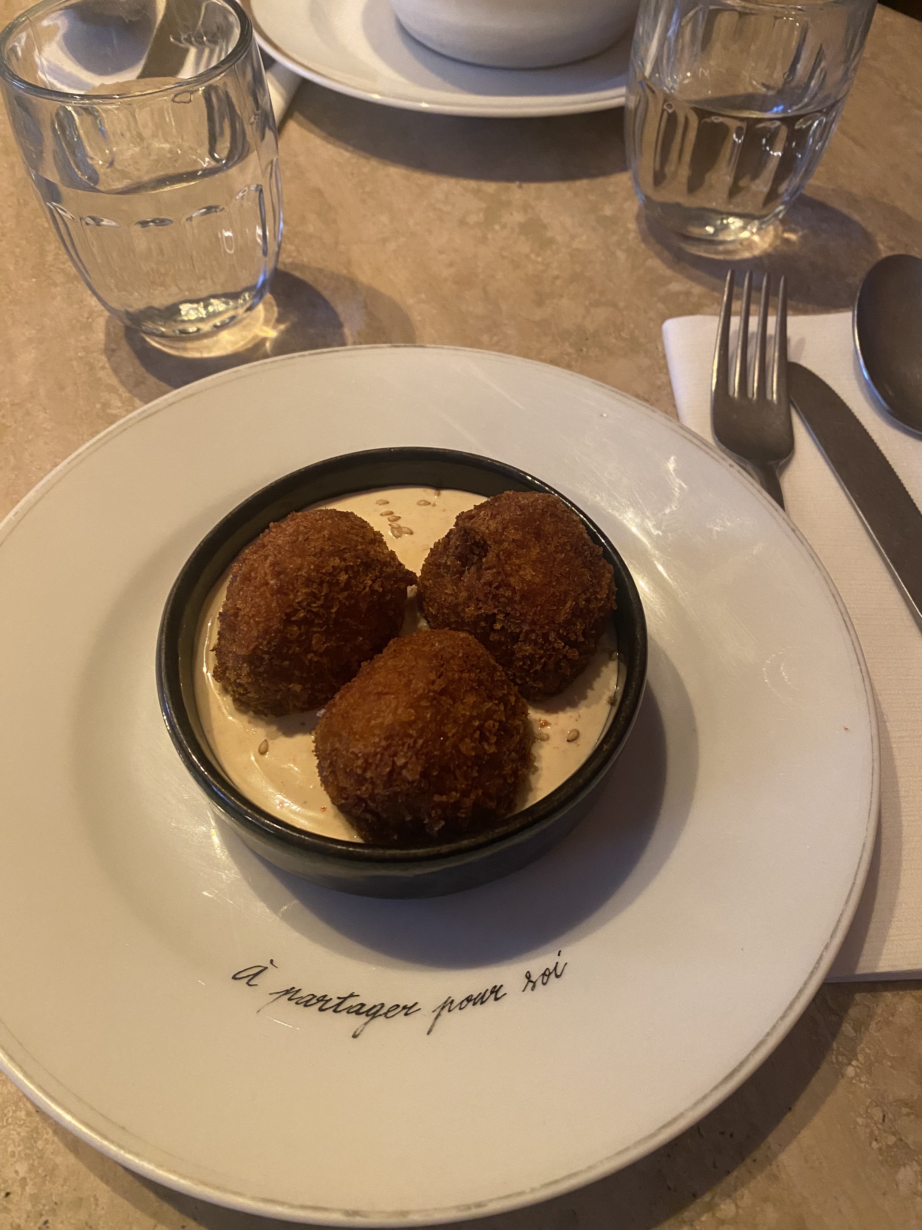 Incroyable, déjeuner du midi avec une entrée très bien élaborée de croquetas de cochon sésame, cream cheese. Le plat fut parfaitement cuit et fondant: agneau et sa galette de pomme de terre. Un souvenir d'enfance grâce à la musique vive Dalida...à refaire d'urgence pour déguster d'autres plats et vins rouges du tonnerre.