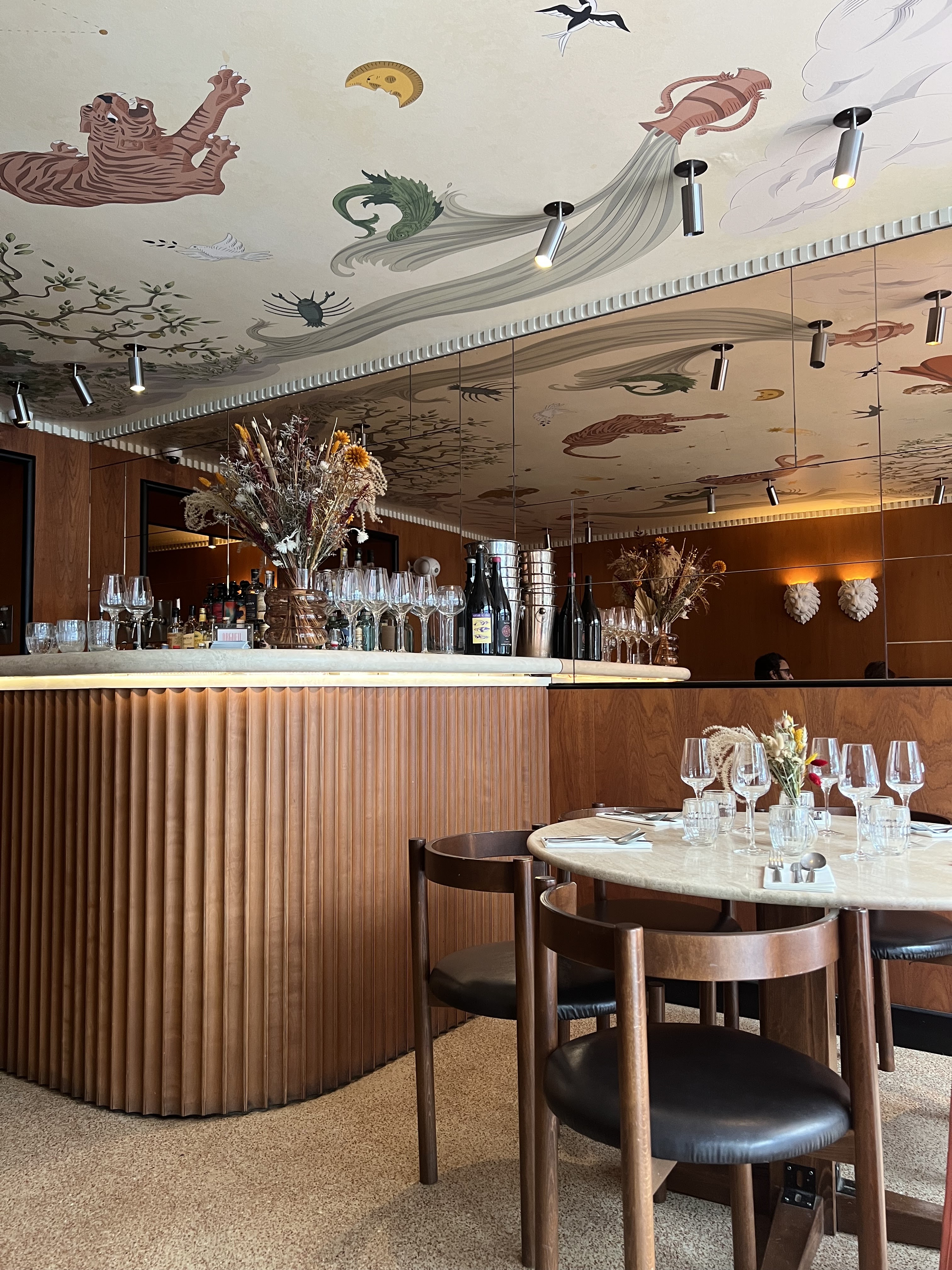 Restaurant au concept très original🔮 En guise de menu, vous avez droit à des cartes de tarot 🃏 sur les thèmes suivants : terre, mer, végétarien, etc. Mais ce n'est pas tout, le plafond du resto est également dans le même thème avec ses jolies peintures. Les plats sont petits mais absolument divins, c'est pour cela qu'on vous propose dès le début de prendre plusieurs plats à partager (les serveurs suggèrent d'en prendre 3 par personne). Nous étions 4, nous avons pris chacun un plat et un dessert. Nous avons également pris le jambon Serrano que nous avons partagé. Cela nous a suffi mais pour les grands estomacs, prendre 3 plats comme suggéré. Mention spéciale aux ravioles de homard qui étaient excellentes 😋 Je recommande ce restaurant pour la qualité des plats, l'originalité du lieu et la gentillesse du personnel.