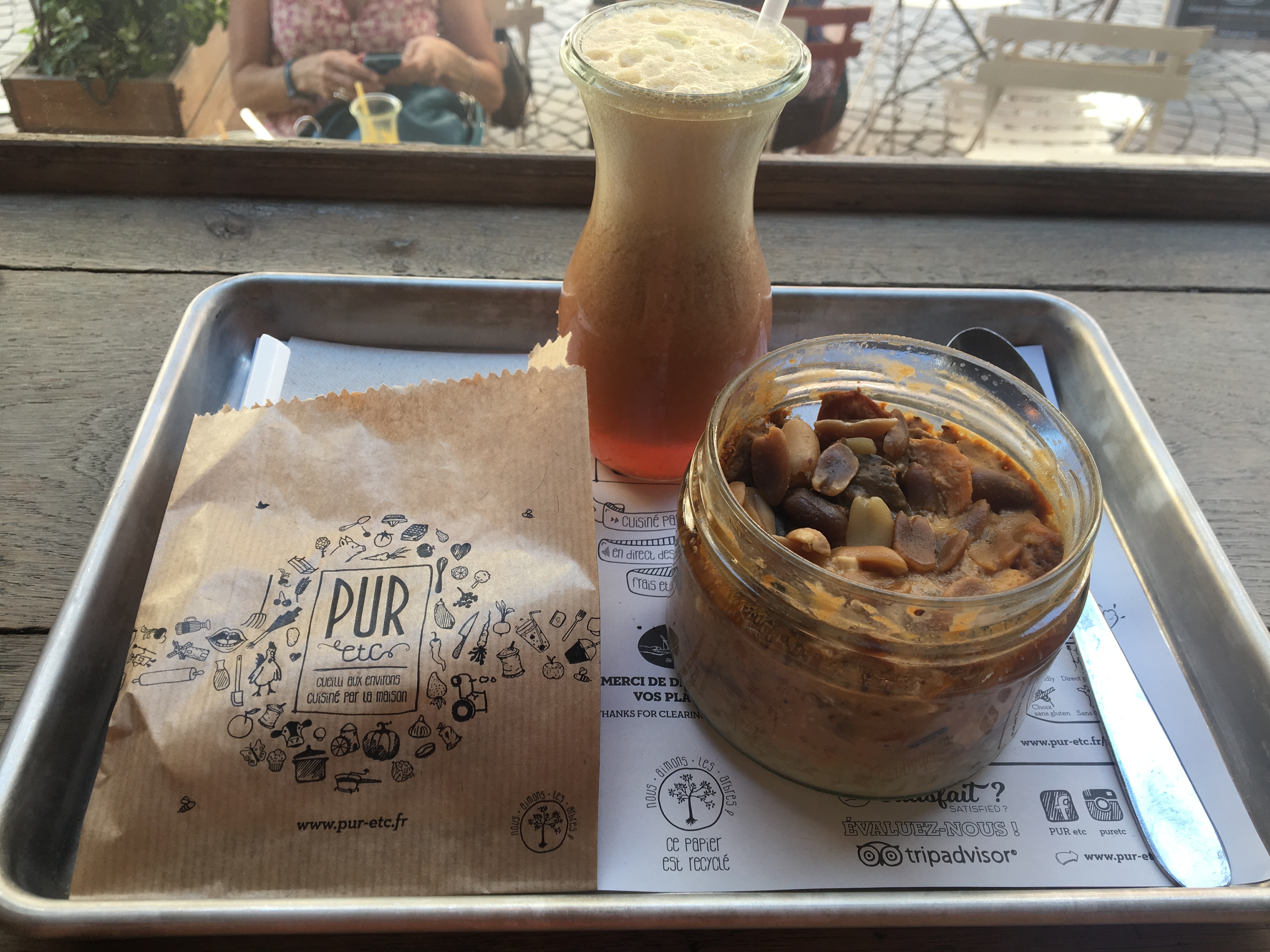 Idéal pour manger sur le pouce ou bien prendre son temps pour les touristes. Très jolie et originale décoration intérieure dans le theme de ce lieu, mais très peu de place et petite terrasse sympathique à l'ombre a l'heure de midi. Plats servis dans des bocaux, originaux, goutus et très bons car beaucoup végétarien donc salades diverses et variées ; ça cale bien. Il y'a des sandwich sans gluten. Formule plat ou formule encas. Bouteille d'eau consigné. Bon rapport qualité Prix. Personnel, je suppose les patrons, super sympathiques et agréables. Je retournerai sans problème.