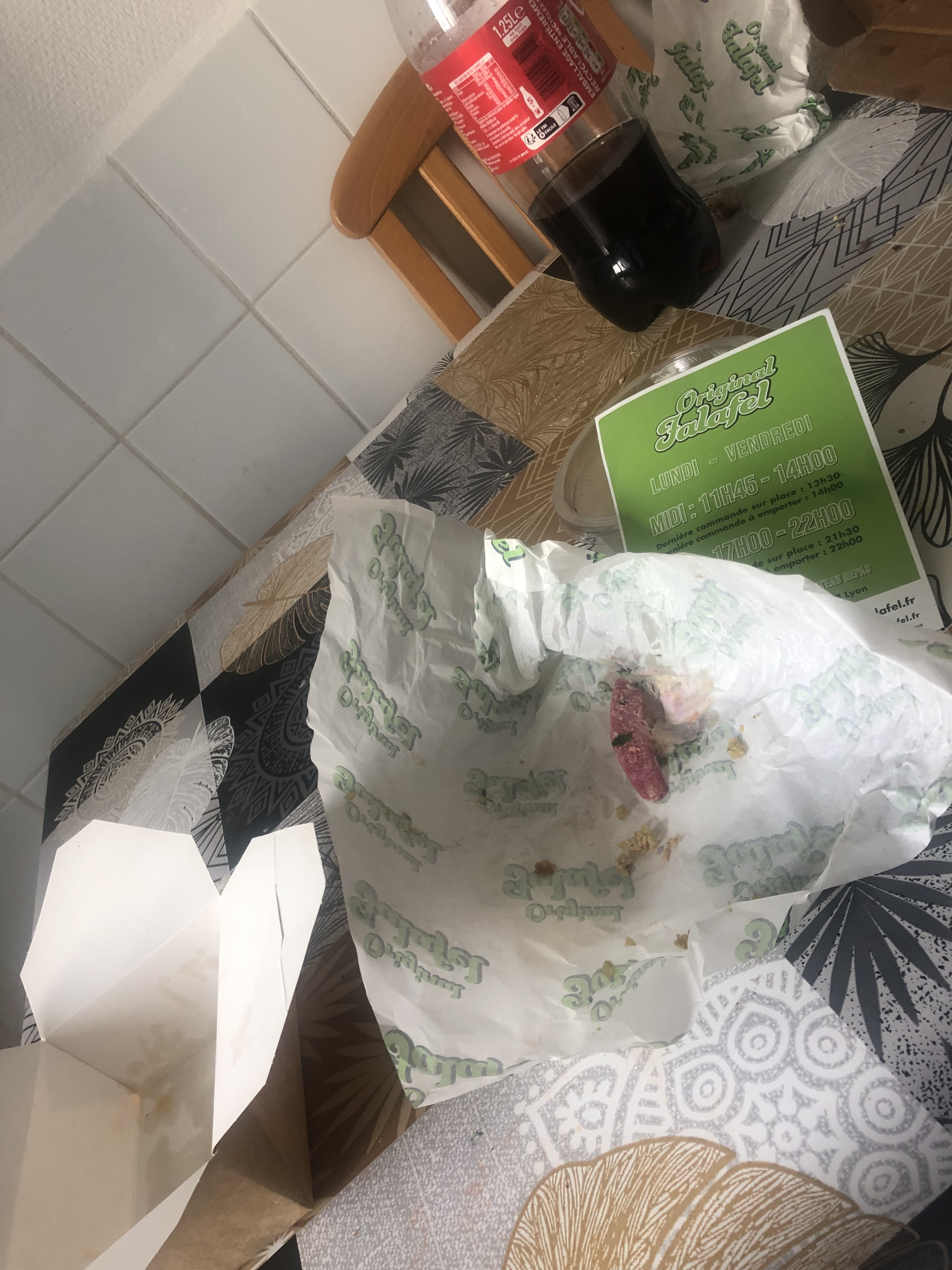 Je viens de les avoir au téléphone après avoir passé une commande UberEats : on a oublié la boisson dans mon menu mais comme ils n’avaient pas de solution pour moi, je suis passée outre, l’eau à la bouche à l’idée de retrouver les saveurs de mon pays. J’ouvre donc mon taboulé pour découvrir une sorte de moisissure le recouvrant. À la poubelle donc. (J’en avais commandé 2 🫠)