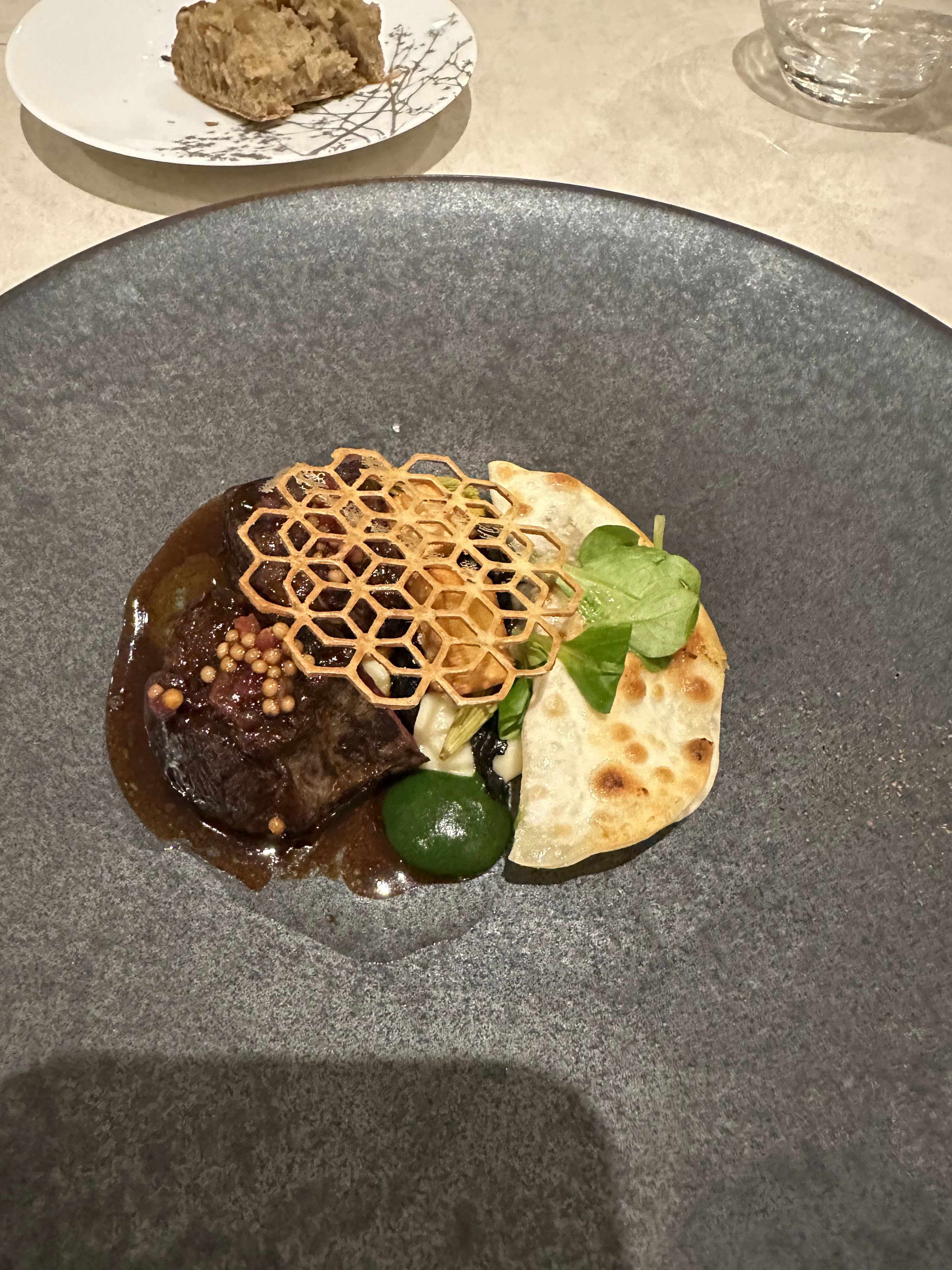 Sentiments partagés. L'amuse-bouche était intéressant, le dessert était également agréable. Le premier plat était bon, puis vient le problème : le plat principal. Ce n’est pas vraiment savoureux et ce n’est pas facile à digérer. Pire encore, les chips frites qui accompagnent le bœuf ont un fort goût rance. Nous l'avons signalé aux serveurs et nous avons reçu un cours supplémentaire en guise de compensation… dont le pain aux noix est également un peu rance. Il y a donc des touches intéressantes, mais le contrôle qualité n’est pas vraiment d’un bon rapport qualité-prix.