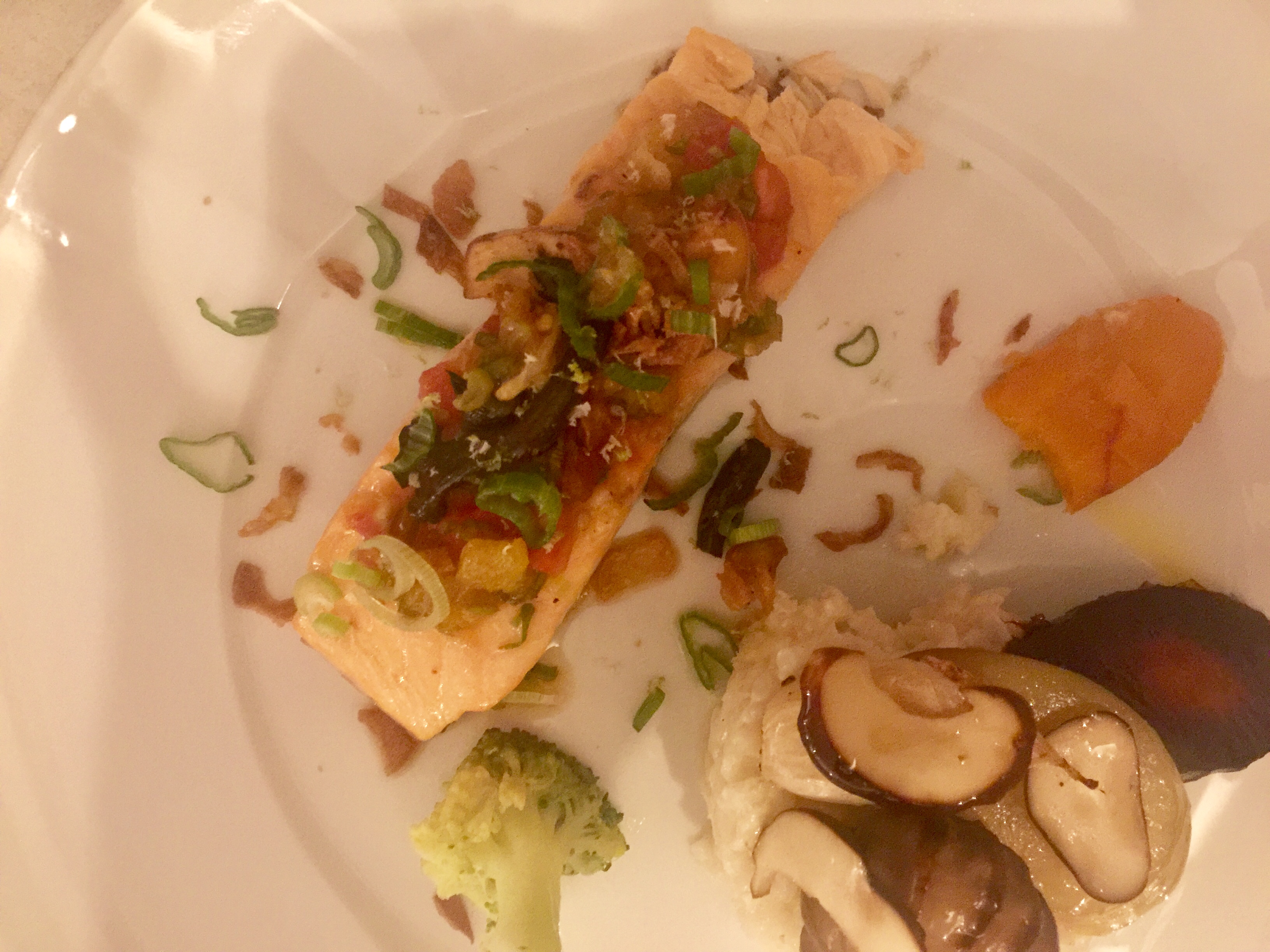 Repas du soir fantastique, l'un des meilleurs plats de poisson que j'ai jamais mangé, risotto à la morue, sans oublier le jambon ibérique et le fondant au chocolat pour compléter le repas.