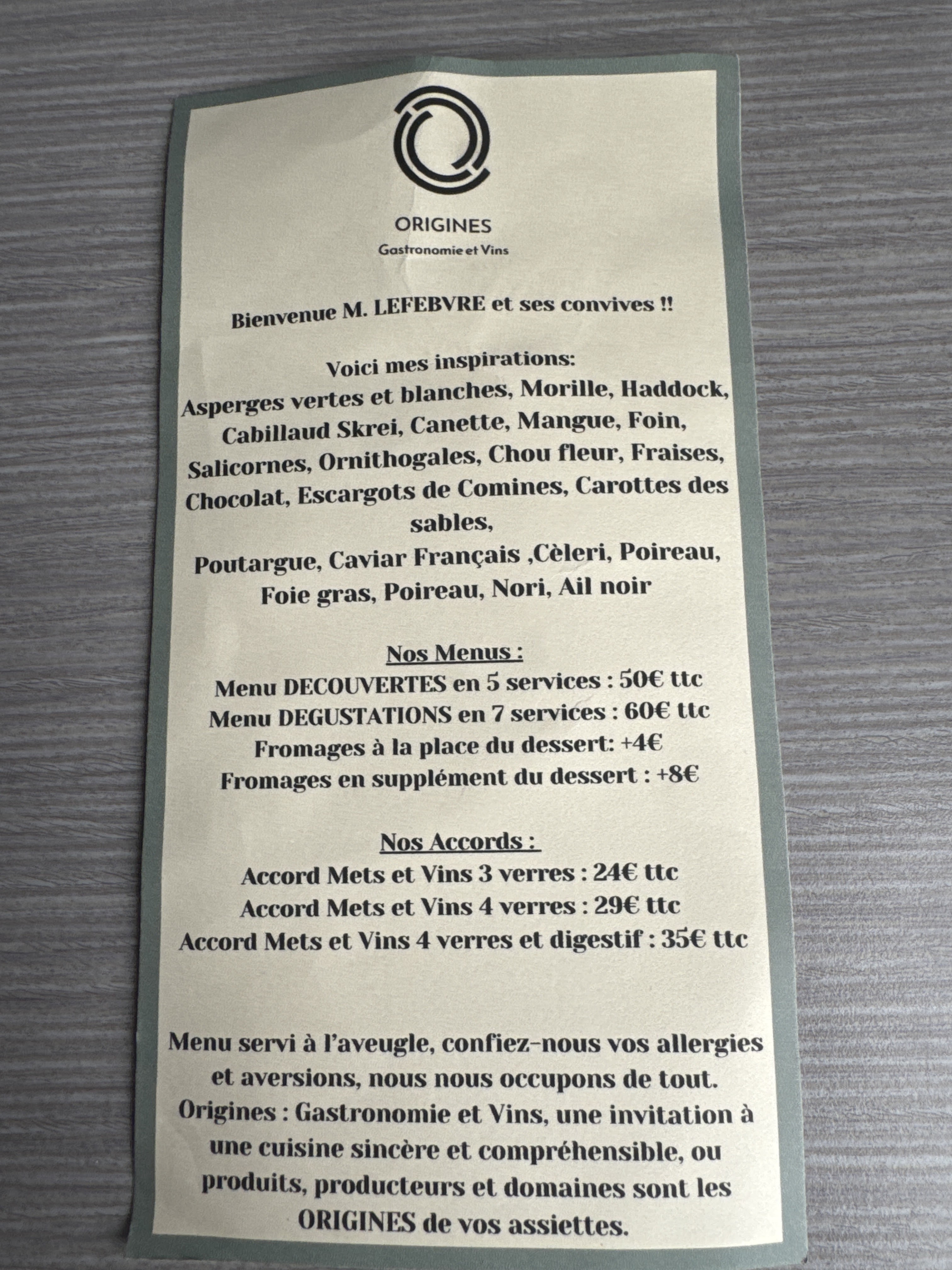 Nous avons testé hier soir le restaurant Origines, cadeau de mes collègues. Quelle belle surprise ! Le gros point fort du restaurant repose vraiment sur le chef Kevin, qui fait un travail admirable tant dans l’assiette que dans le service. Tout est excellent, des plats aux vins (prenez l’accord mets vins, c’est un véritable voyage à travers différents vignobles et cépages). Il y a bien longtemps que nous n’avions pas été aussi bien accueilli, accompagné et conseillé tout au long du repas. Les saveurs sont également au rendez vous dans l’assiette avec des mélanges audacieux et raffinés. Le cabillaud en Maki est un chef d’œuvre !!! L’expérience est même personnalisée dès le début grâce au menu ! Super idée ! En résumé vraiment un super restaurant mené par un chef motivé qui met tout en œuvre pour vous faire passer un moment exceptionnel… BRAVO ! On reviendra, c’est certain ! 😊