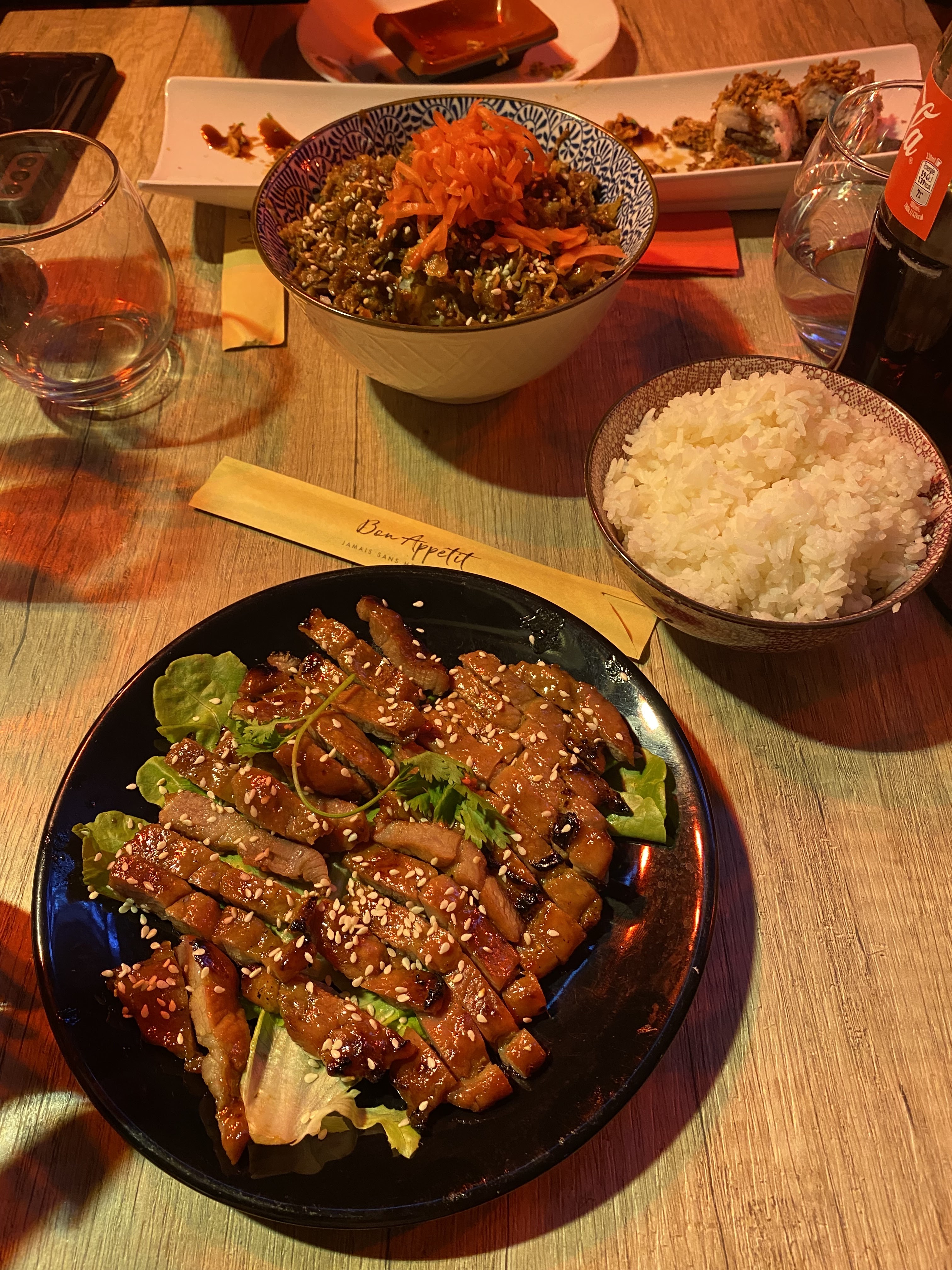Que dire, un délice, un petit moment de bonheur partagé en famille. Je recommande vivement, cela fut très bon, bien présenté, j'aurais même pu plonger dans la sauce soja par ce temps idyllique. Venez !!!
