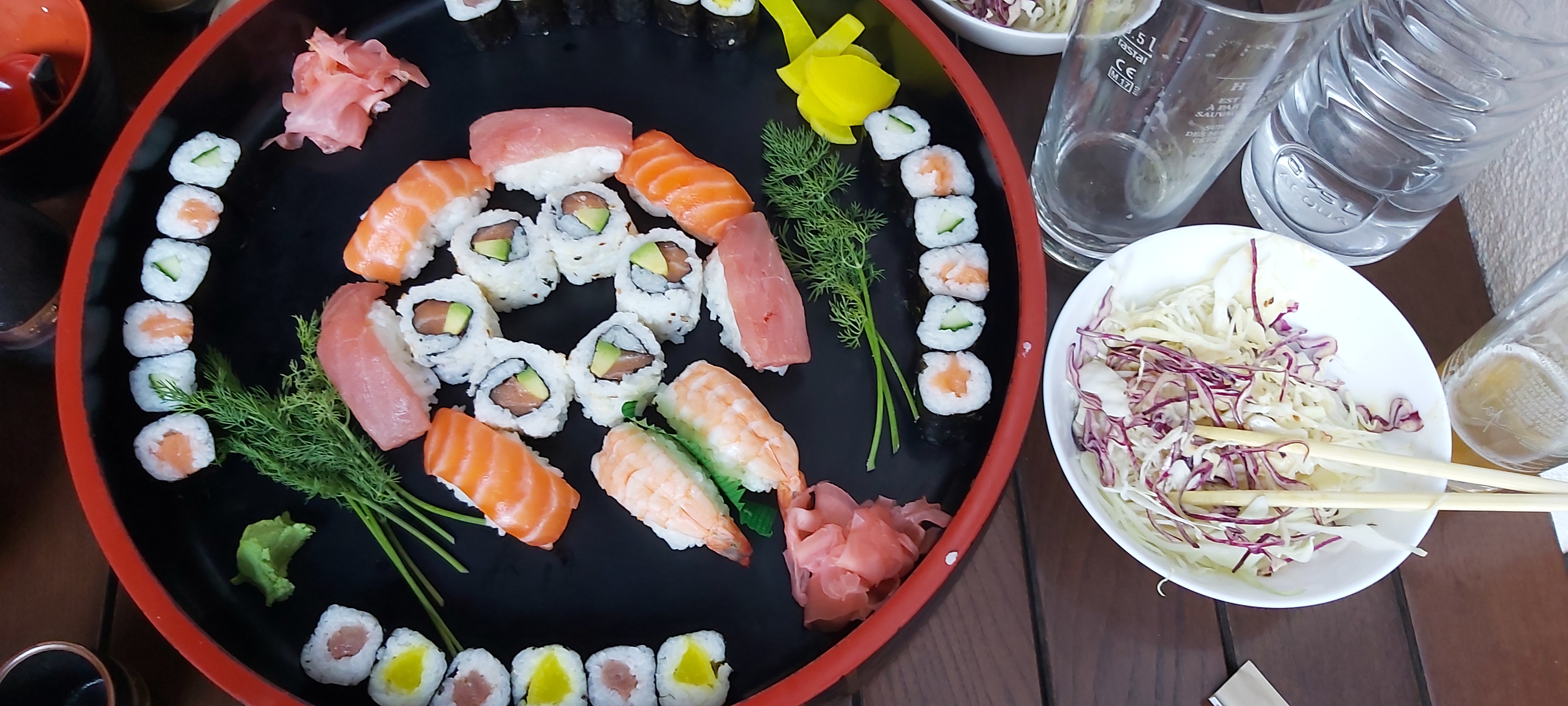 Sushi pas franchement extraordinaire... c’était pas mauvais pas non plus de quoi marquer les esprits...! Salade de chou trop fade. Service sympathique et cadre sympa aussi!