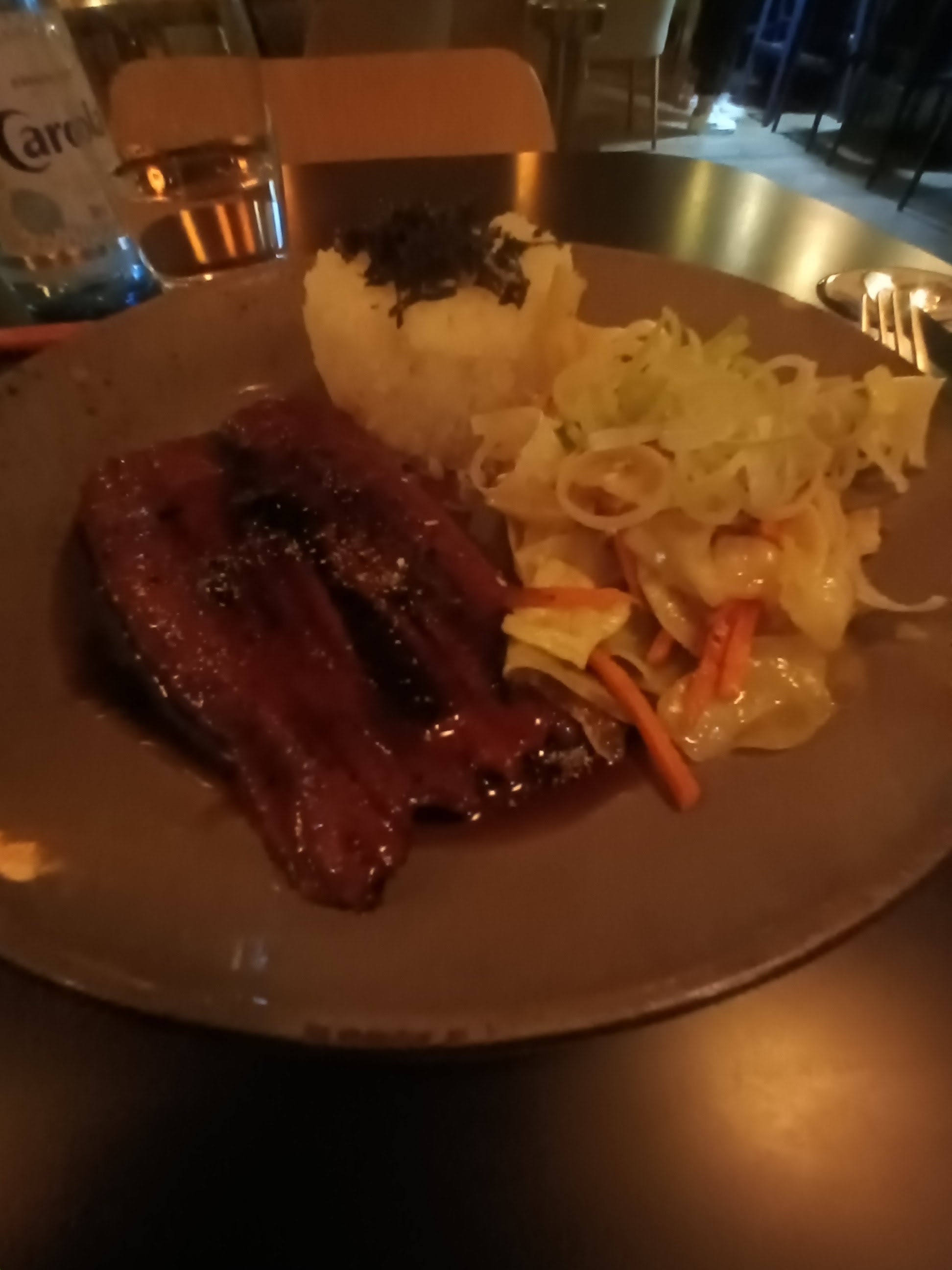 Un restaurant avec une ambiance tamisée très agréable, les tables sont bien positionnées, et la musique de fond n'est pas forte et est appréciable. Un service rapide, des employés professionnels et très souriants. Les plats sont très bien servi, malgré de petit désagrément comme le bœuf pas assez cuit. Autrement les aliments proposés sont très bon. Je recommande ce restaurant car on y passe un bon moment et on y mange bien.