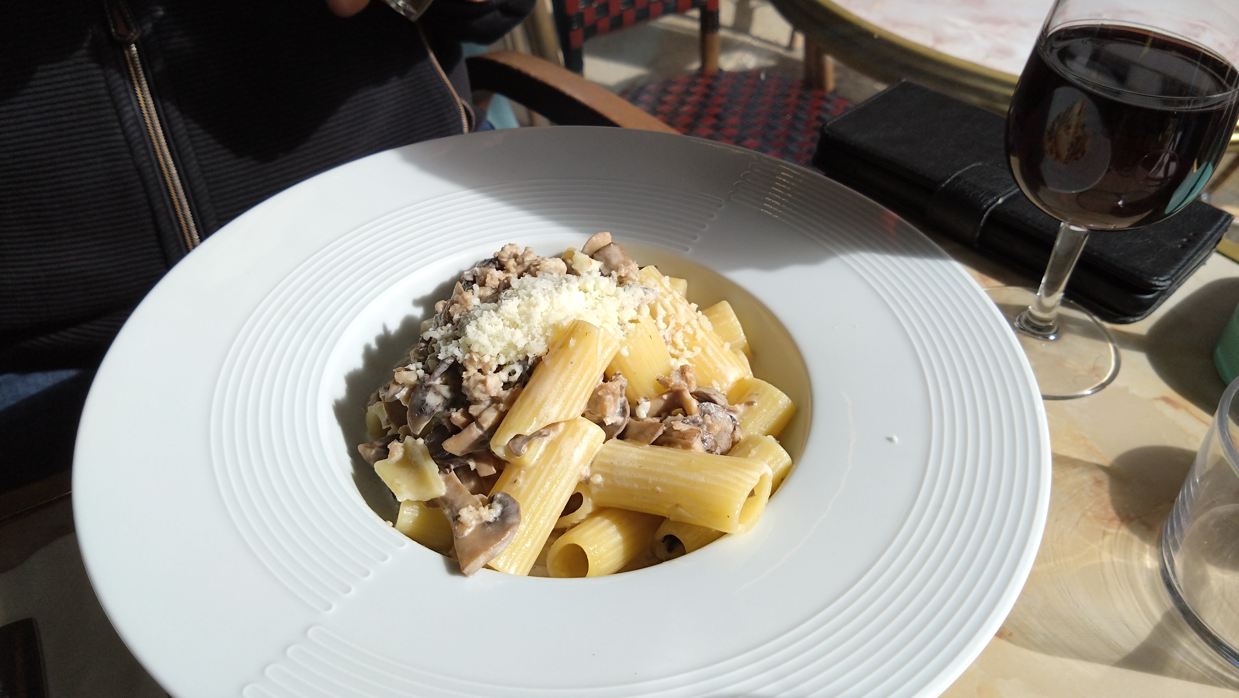 Plat de pâtes, rien a dire. Très bon. Le café gourmand, évitez le, il n'en a que le nom. La salade de fruits est très limite, le baba au rhum est grossier et n'a rien a faire dans un restaurant. La serveuse est très gentille mais de grâce arrêter de faire du forcing toutes les 5 minutes pour faire de la vente additionnelle. C'est fatiguant et contre productif.