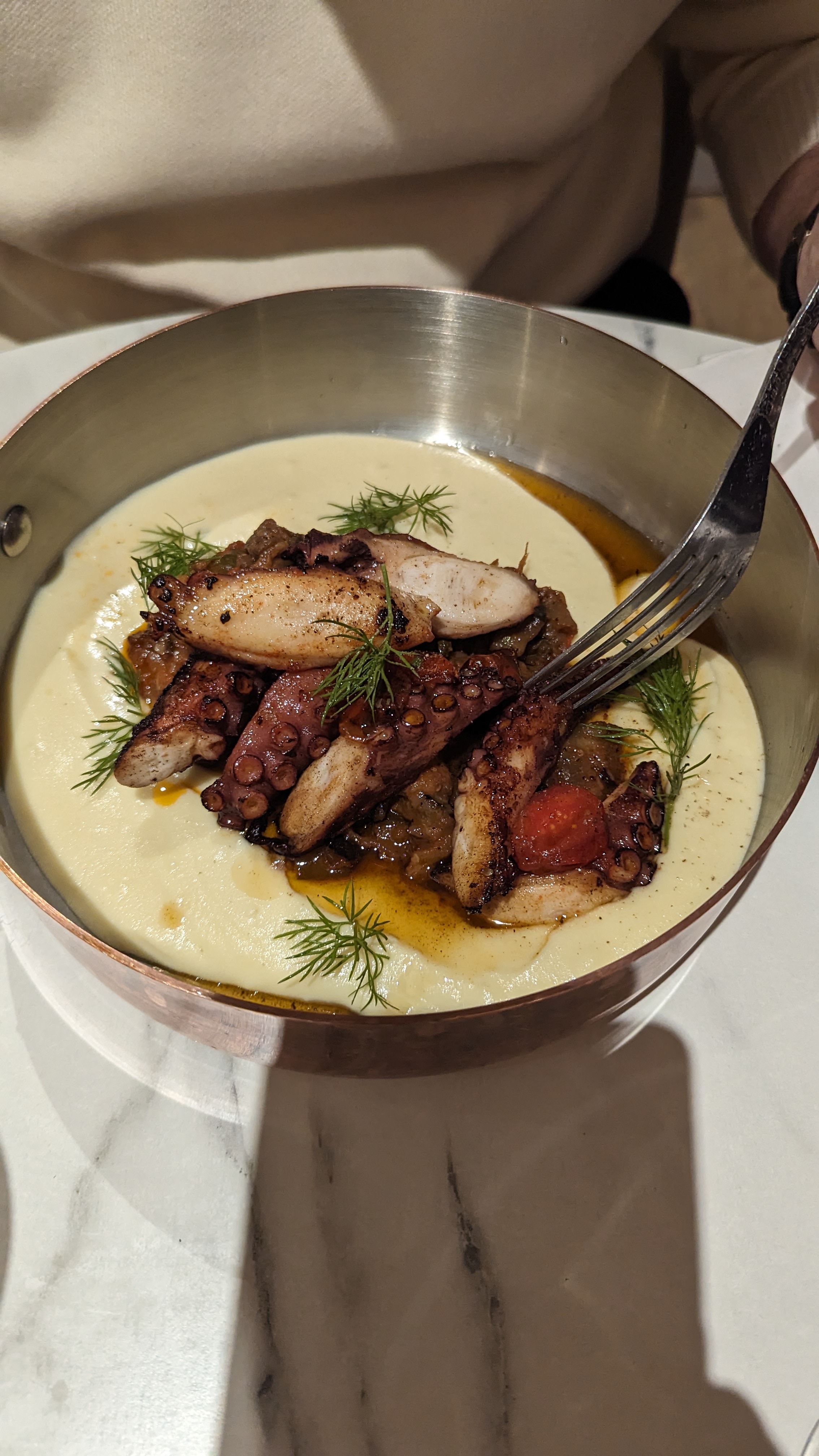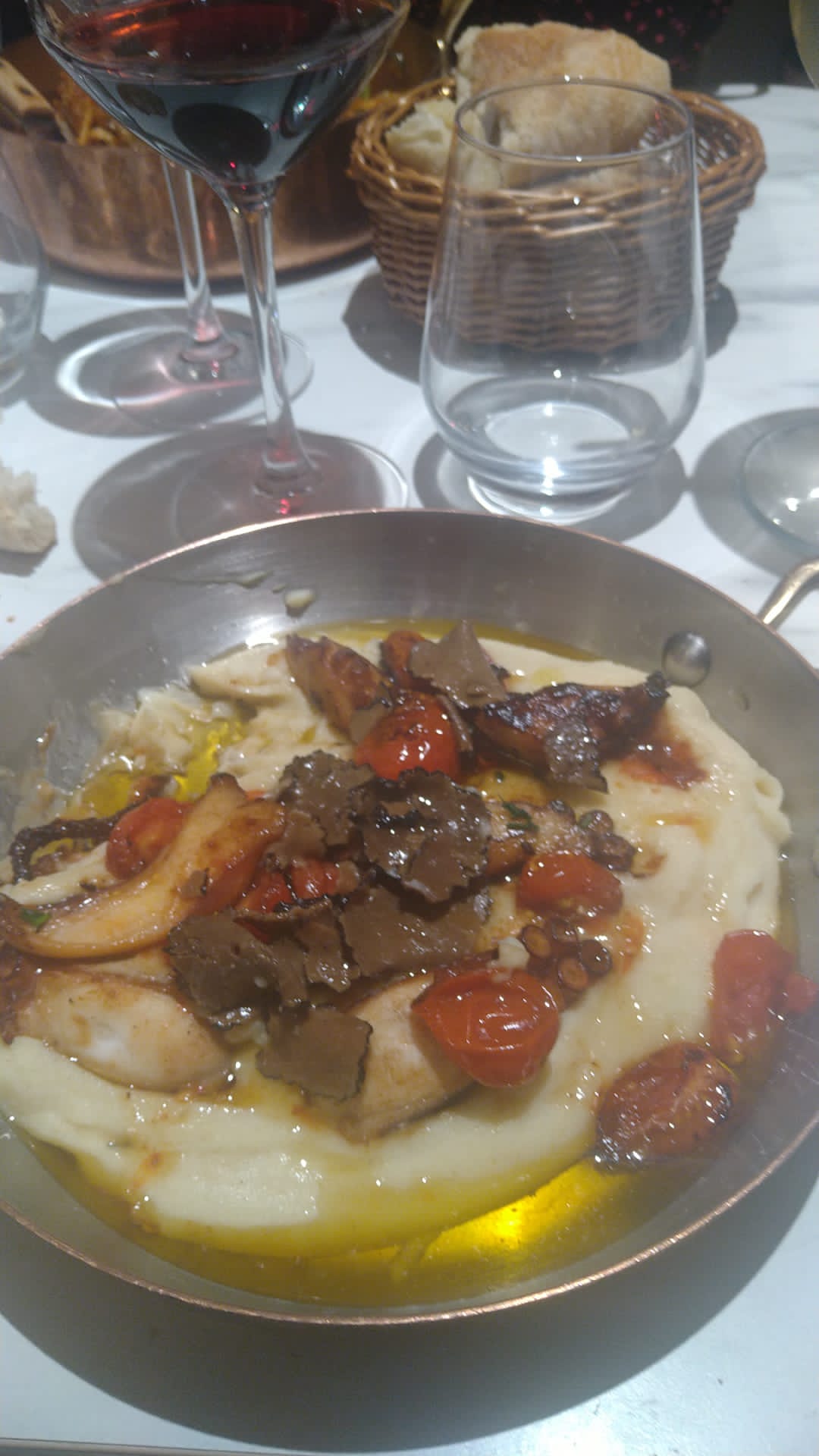 Bonne cuisine dans l ensemble même si le poulpe est très décevant. Je ne suis pas sûr qu'il en est 100gr dans l assiette mais c'était bon. Les pizzas sont bonnes mais à 20€ c'est le minimum. Nous étions 4, il y a eu aussi des pâtes, c'est de loin le meilleur plat. Côté ambiance c'est vraiment sympa même si on est vraiment serrés à table.