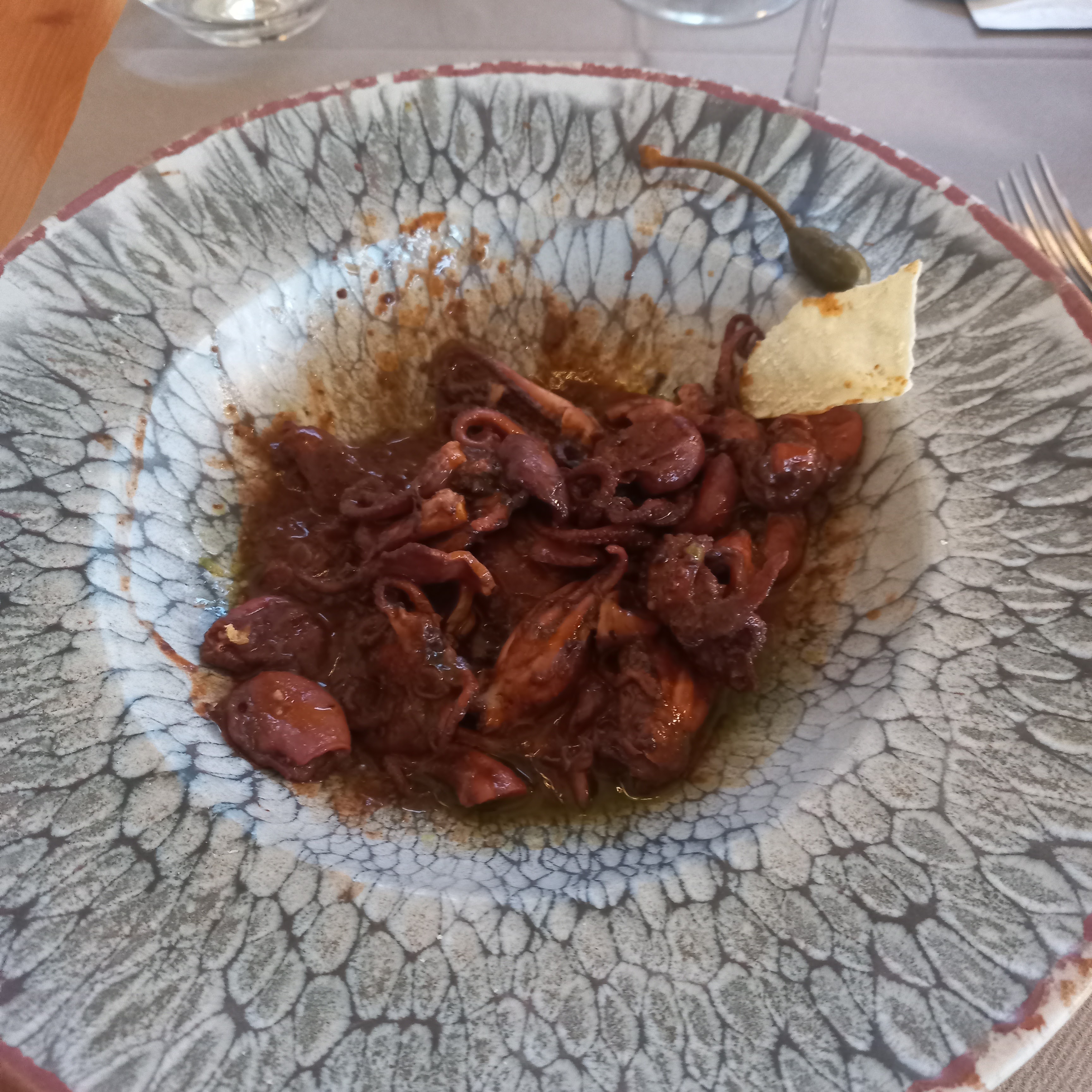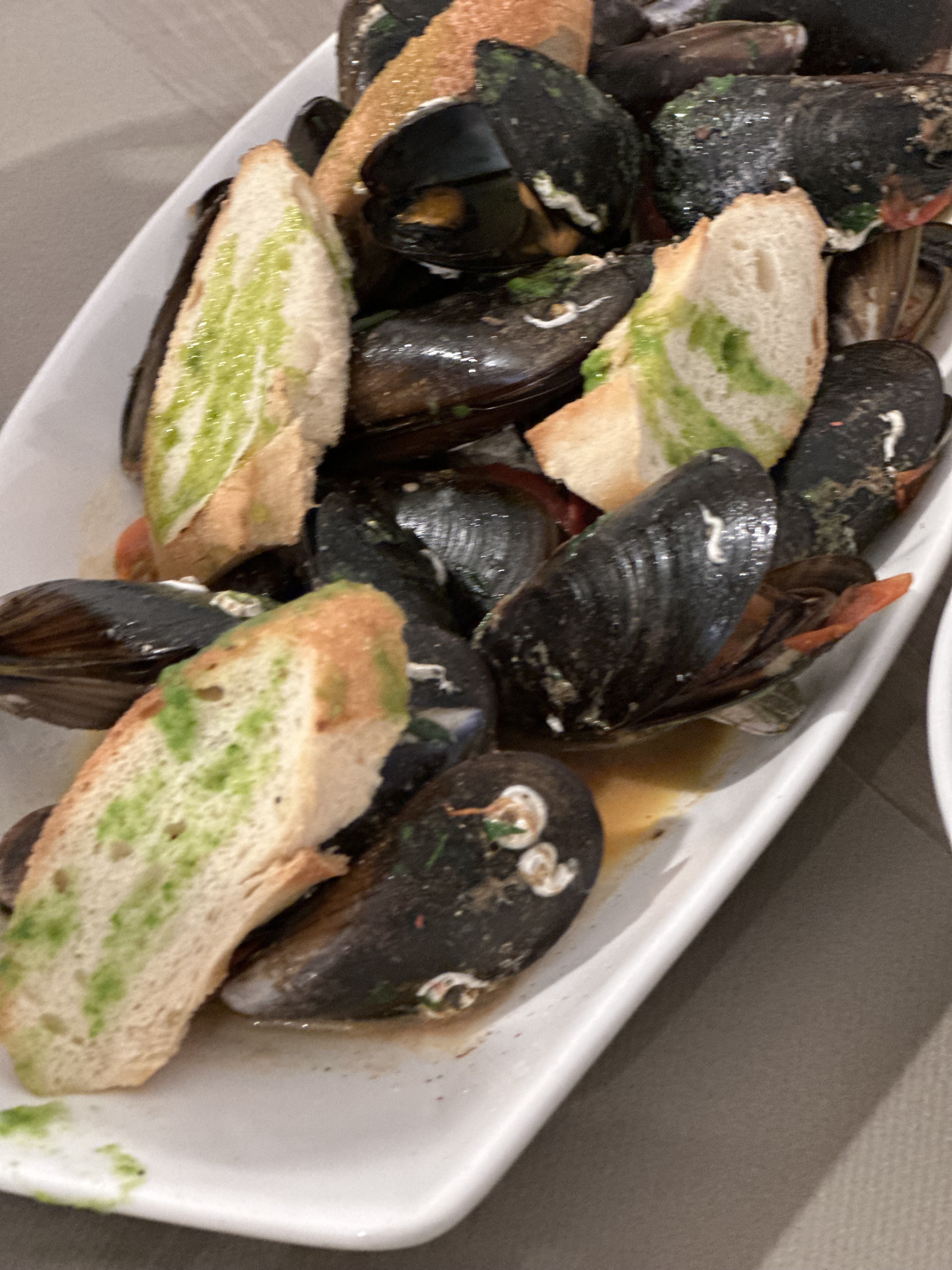 Première fois de ma vie qu'on me servait des huîtres recouvertes d'huile d'olive et de persil, du poulpe à la Luciana qui n'était qu'une sauce concentrée de tomates, et des paccheri aux palourdes, crevettes mantes et poutargue, assaisonnés de la même sauce tomate que le poulpe, 4 crevettes surgelées à la place des crevettes mantes et botrharga totalement absentes, il vaut peut-être mieux changer de métier