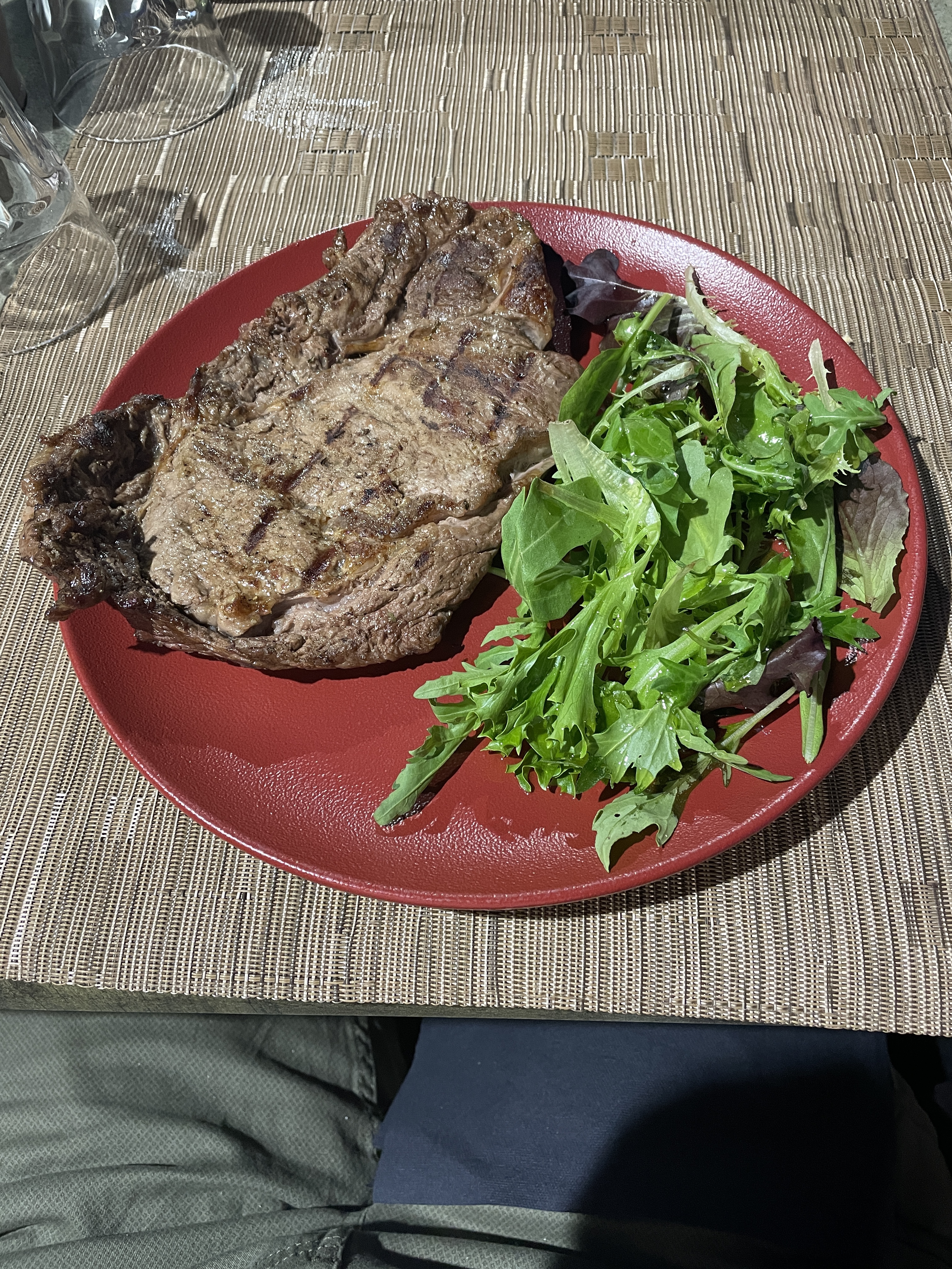 Beignets de fromage brulés, brochette de boeuf viande extrêmement dure, salade verte autant d'ail que de salade, si vous n'aimez pas l'ail ou ne le digérez pas accrochez vous, vin rouge chaud, et même pas de digestif offert...