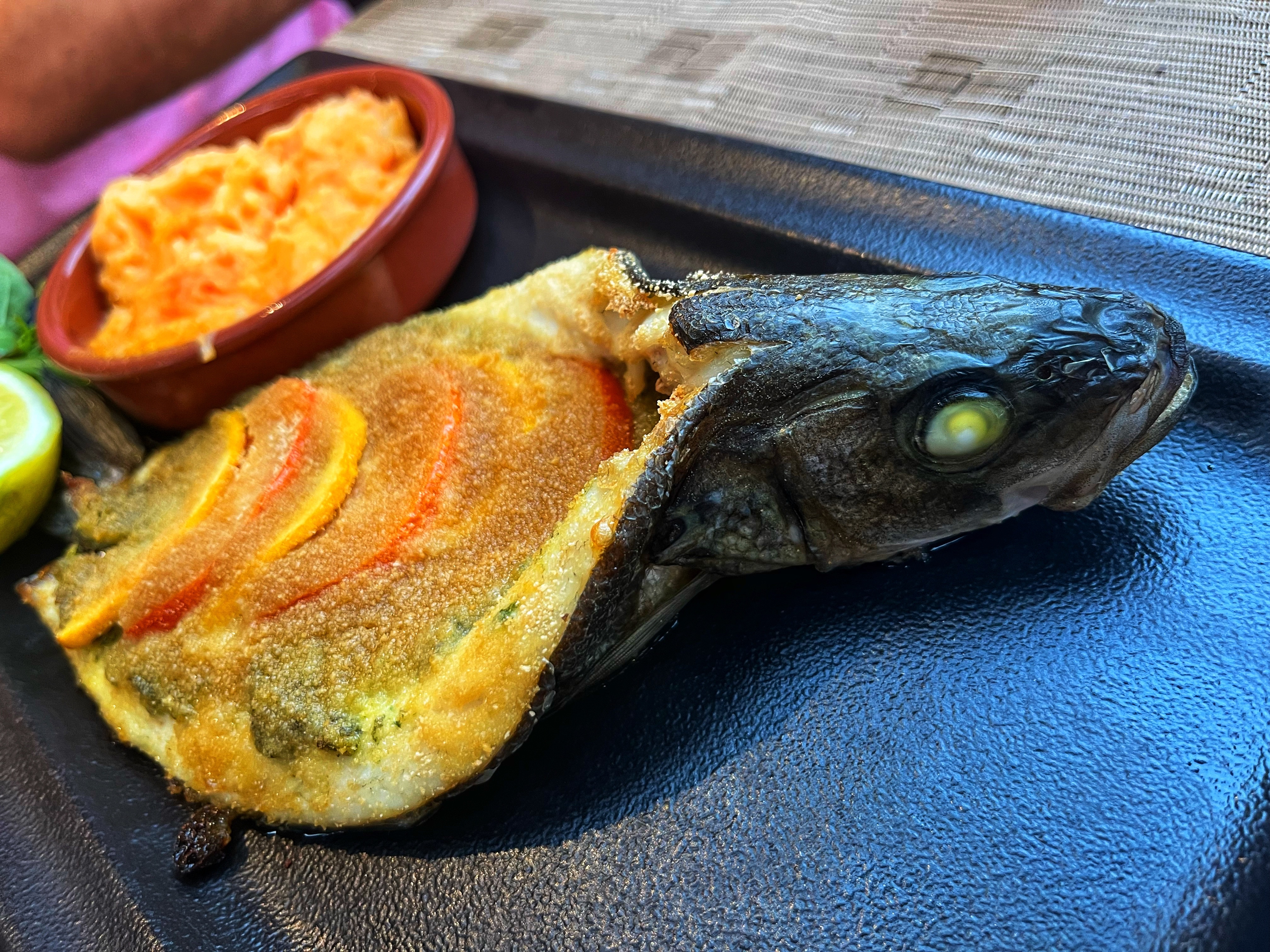 On est loin du petit restaurant avec vue sur la plage MAIS …vous y dégusterez enfin une véritable assiette de charcuterie corse 🐷. Pour ceux qui ne mangent pas de viande , vous opterez sans doute pour le loup 🐟 ( voir photo ) ou pour les gambas 🦐 En entrée , planche de charcuterie , spécialités corses Migliaccioli (crêpes corses au fromage de chèvre 🐐 frais ) ou beignets de légumes 🥒. Bref , le prix est correct et la quantité et la qualité sont là . Le tout , dans la simplicité 👍🏻