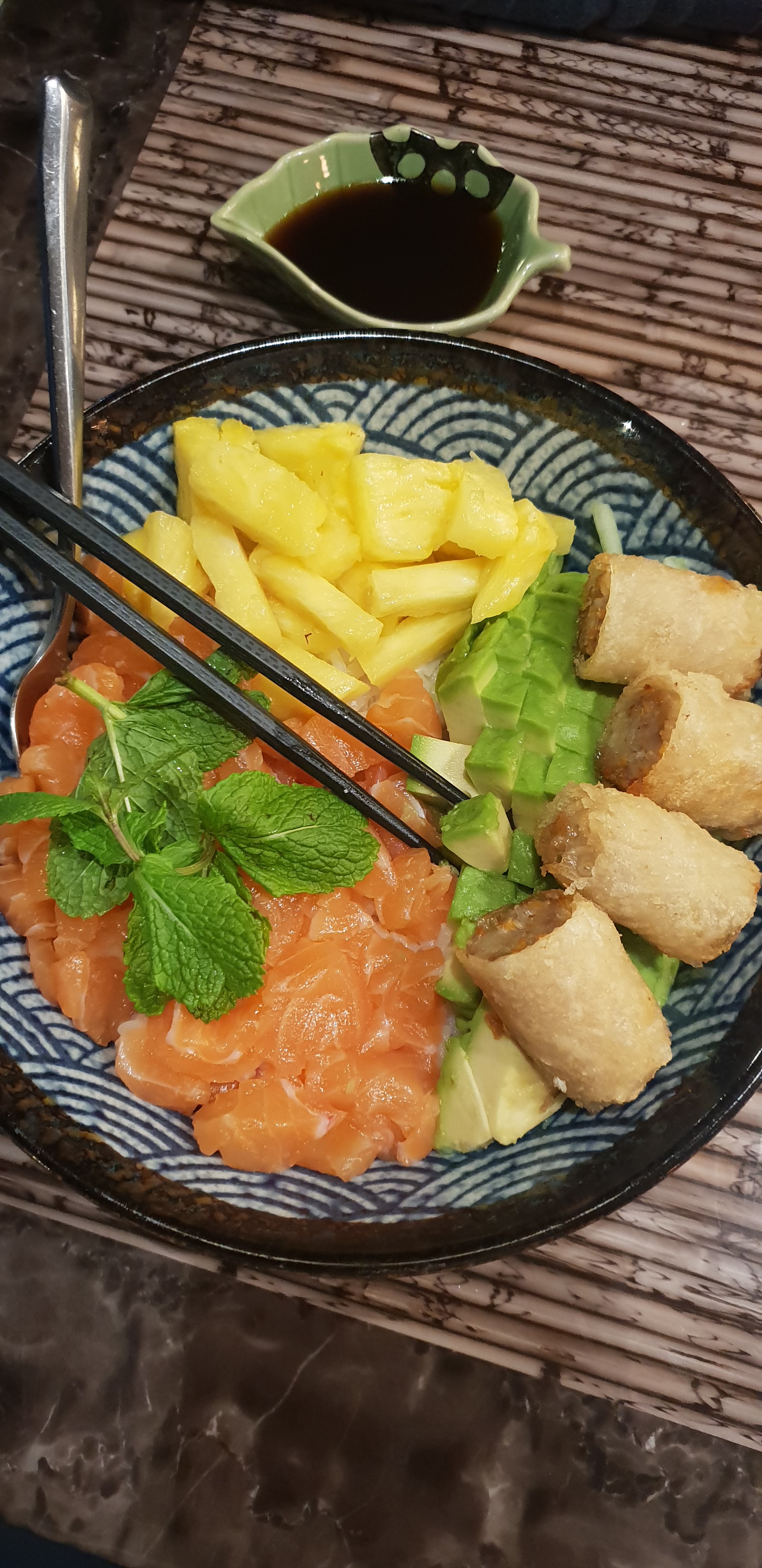 Belle découverte et belle expérience dans ce restaurant au cadre agréable et aux préparations délicieuses. J'ai choisi pour cette première fois : un menu composé de 6 brochettes + 6 makis saumon; 6 sashimi saumon et 2 nigiri saumon. Dans le menu est inclus une soupe au tofu; un bol de gohan (riz vinaigré) et une salade (voir la photo). J'ai également opté pour une part de nem. Pour un total d'environ 21€. Points forts : - Un voyage gustatif qui vaut le détour. - Le cadre est agréable et les chaises très confortables. - Personnel accueillant et souriant. - Service rapide de qualité. - Qualité du poisson excellente. - Gros coup de coeur pour les nems.😊 - Prix abordables et raisonnables. Points faibles : - Je n'ai pas relevé de points faibles pouvant impacter l'image de ce restaurant. Conclusion : Une belle expérience gustative. On ressort du restaurant léger même si les mets sont importants en nombre. C'est une cuisine qui se savoure. Je recommande ce lieu vivement pour ceux qui ont l'amour de l'Asie ; qui veulent voyager avec leurs papilles; qui ont eu une mauvaise expérience avec les sushis (vous serez réconcilié !) et ceux qui cherche un endroit ou bien manger dans un cadre agréable, sans se presser et sans se stresser.😉