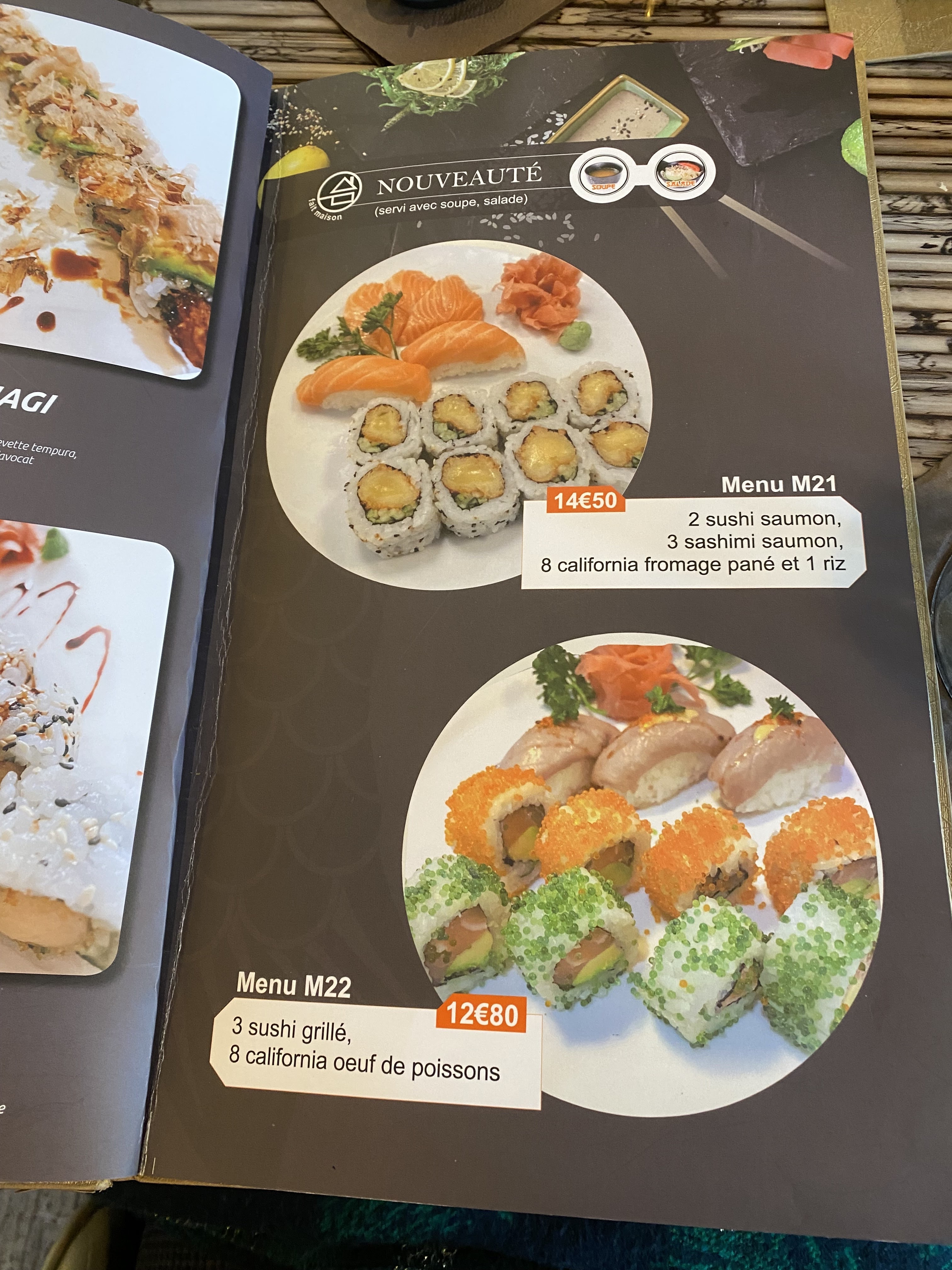 Sashimis grossiers, découpe trop épaisse, très fades. Soupe ok, salade bof et raviolis en revanche très bons. On apprécie les menus variés sushis et raviolis et la proposition végétarienne. Dommage pour le goût fade et la découpe - ne peut-on pas découper fin ??!! - très peu de wasabi aussi, bref, déception.
