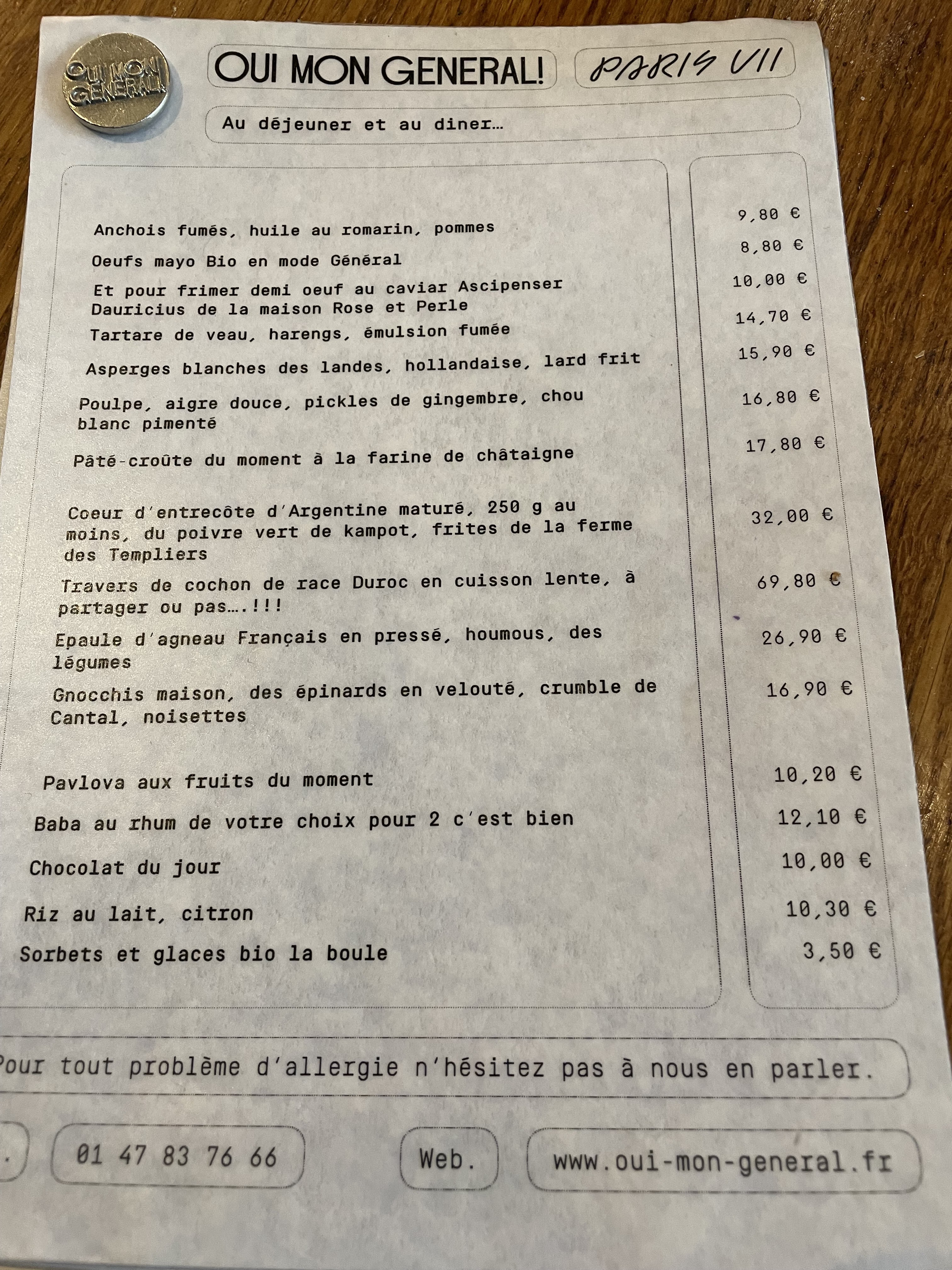 Un cadre sophistiqué, rustique et comme à la maison.... des plats d une simplicité et d un raffinement, des saveurs surprenantes... y retourner car le sanglier ou le baba n ont pu être goûter ce soir là (rhaaaa!!!) .. en faisant confiance à l équipe (GÉNIALE ) , ils vous apportent le verre de vin qui vous convient. . Je suis épatée et l adresse est vraiment bonne!!! (Pour les amateurs de bonnes choses et bon vivants. Les autres, passez votre chemin ! !!) Au fait, il s appelle maintenant OUI MON GÉNÉRAL ! !!