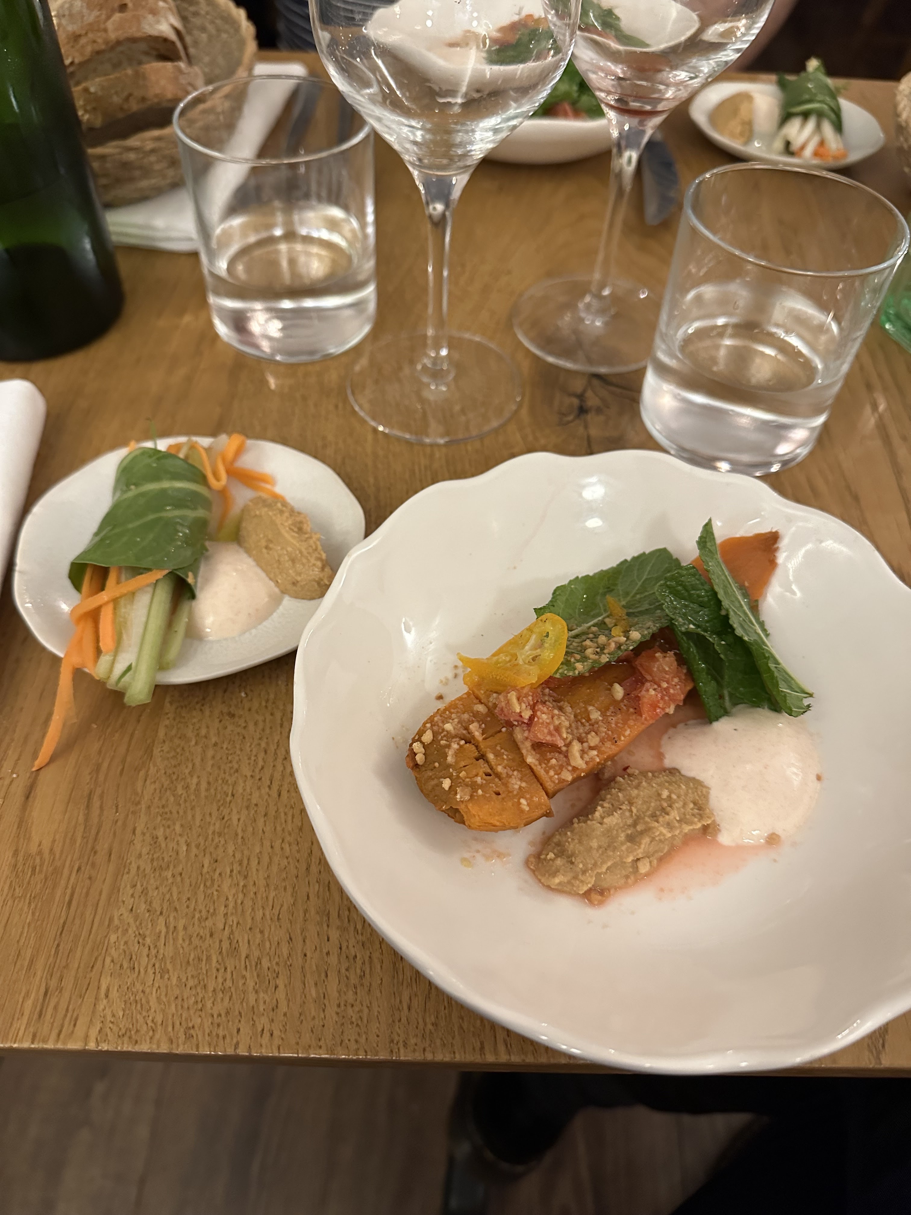 Très belle expérience dans ce restaurant. Au menu : le choix entre 3 entrées / 3 plats / 3 Desserts et une belle carte des vins ! Au menu pour moi, de la courge rôti, avec du yuzu, des champignon, graine de sarrazin accompagné d'une brioche salé maison suivi d'agneau avec des gnocchi, un pesto a la menthe et de blette.