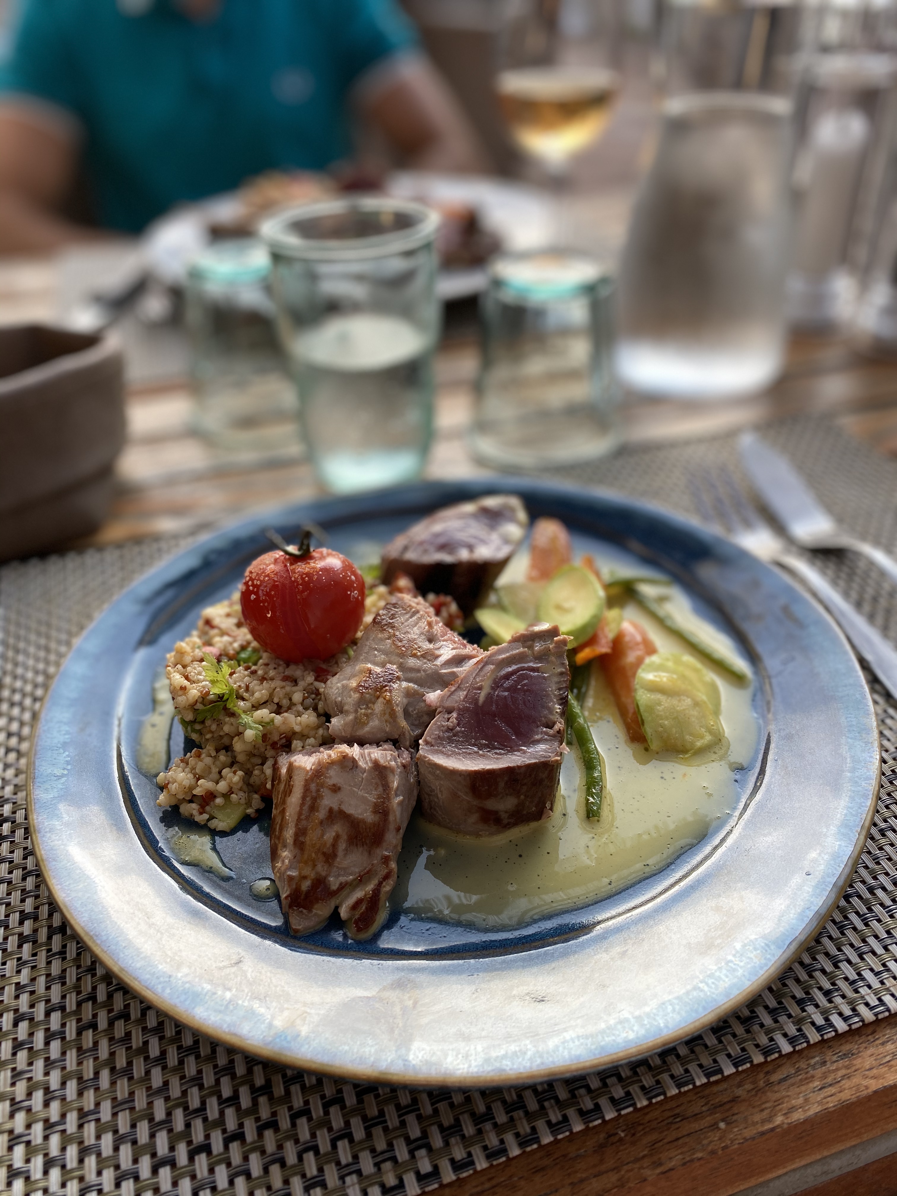 Le restaurant est très sympathique! Belle terrasse et décoration agréable. La nourriture est délicieuse et abordable au niveau prix. Le personnel très gentil. Petit bémol pour la qualité de la nourriture lors de la soirée gipsy du jeudi. Nous avions réservé pour le lundi, puis changé pour le jeudi à la dernière minute sans savoir qu’il y avait cette soirée à thème et personne ne nous en a parlé avant. Notre fils était ravi avec les guitares mais les plats n’ont rien à voir avec ceux du menu à la carte. L’hôtel est très bien également, malgré le prix un peu élevé des chambres et du petit déjeuner