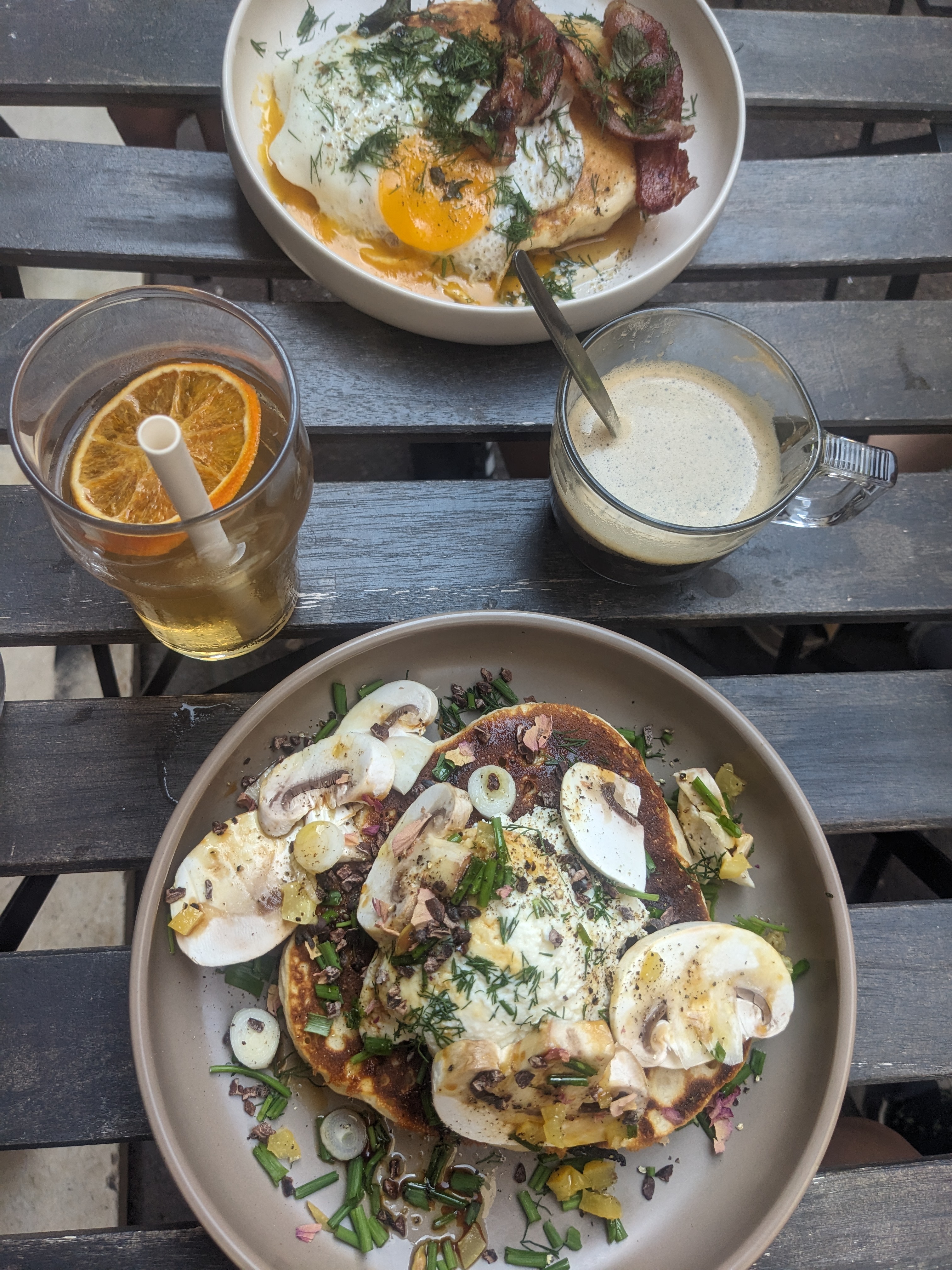 A la recherche d'un brunch a Marseille, nous sommes tombés sur Oyat. Installés sur la terrace nous avons goûté les 3 plats du brunch : maxi pancake savoureux et copieux, plat d'oeuf également goûtu pour ceux qui veulent plus de verdure dans leur plat. J'ai rajouté un oeuf au pancake champignon : option veggie gourmande, delicieuse. Des prix très abordables (10€ le plat environ). Belle adresse 👍
