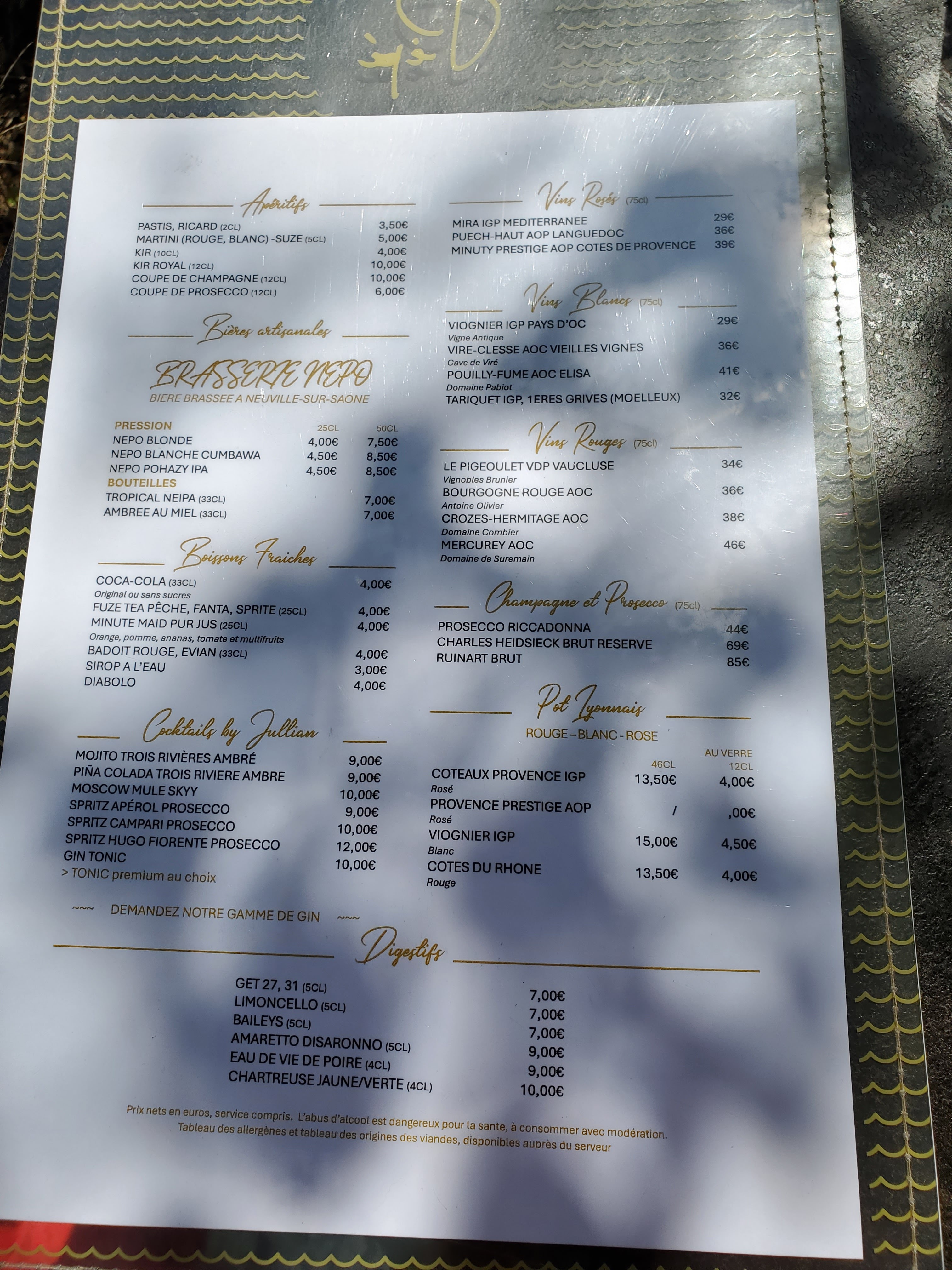 Pour le négatif : allez-y avec du désinfectant pour lire le menu qui est crasseux et qui pue et restez sur la terrasse couverte (et pas celle du bord de Saône) si vous voulez voir ce qu'il y a dans votre assiette après la tombée de la nuit. Pour le positif ; accueil agréable et mise en garde tout à fait honnête sur le problème de lumière indiqué supra. Nourriture convenable. Serveur sympa.