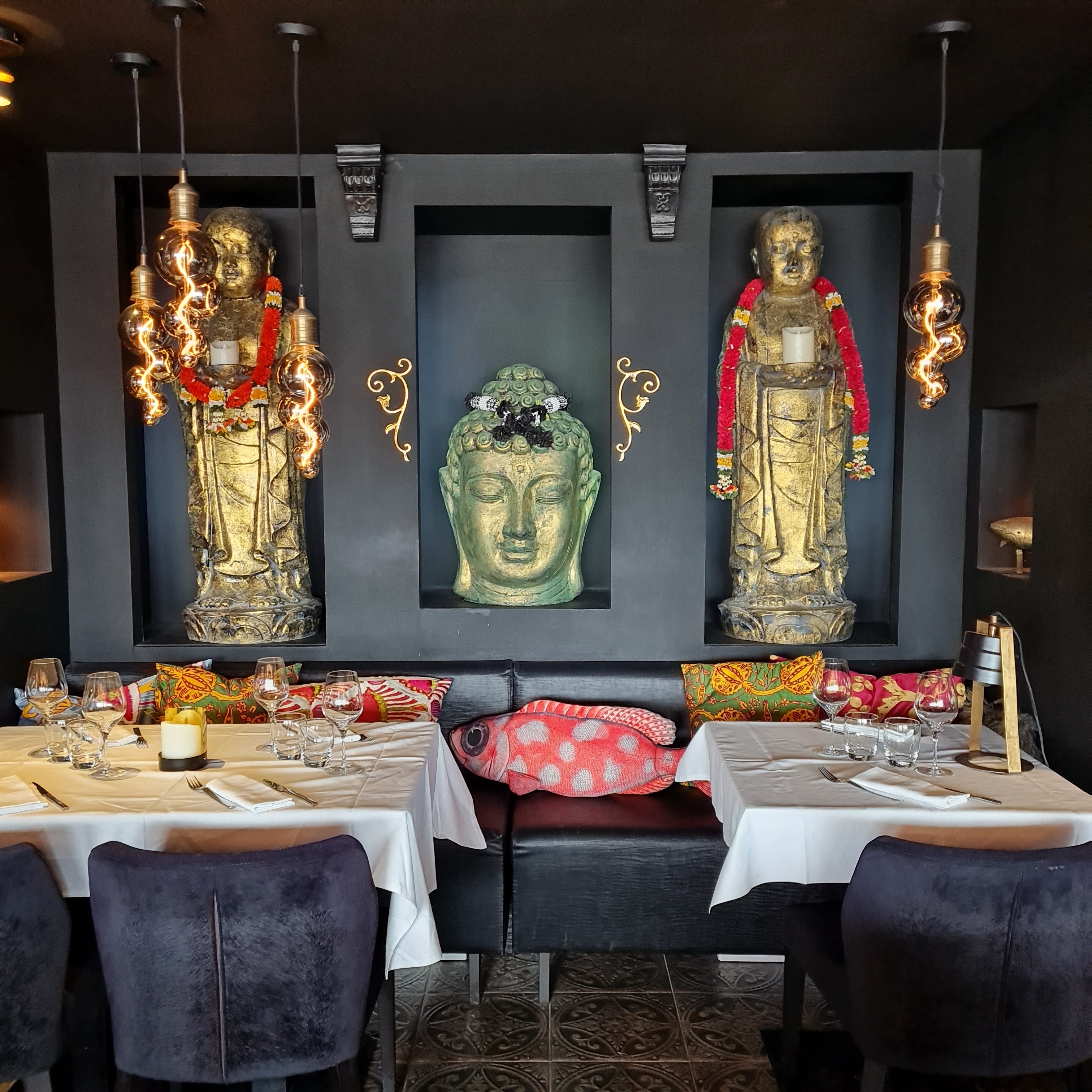 Lieu très beau, bouddhas, lumières, tout crée une atmosphère grandiose, patron et personnel au top : attentionné, discret, pro et à l écoute! Plus les mets originaux, délicieux et bien dosés en épices : un régal et un bon moment : notre invitée était ravie, nous aussi Merciiisss !🐝💚🍀
