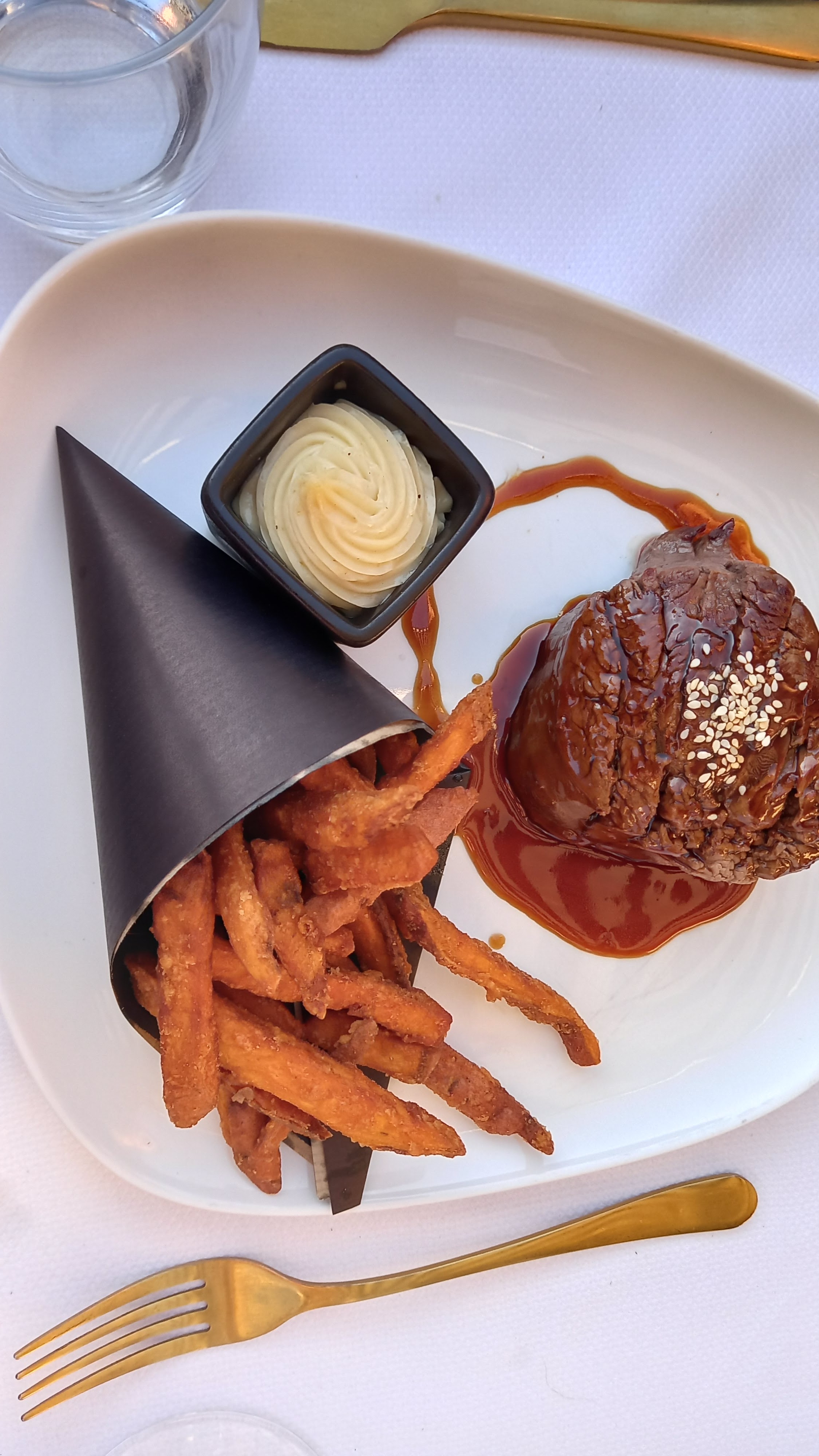 Être accueilli par Pascal est un plaisir. Il est dans son élément. Le décor est magnifique, la vue sublime. Allons directement aux plats. On écoute avec attention la description des plats. Mais il faut choisir, ce qui est parfois difficile tant notre hésitation est grande. Un plaisir des yeux et un plaisir gustatif.