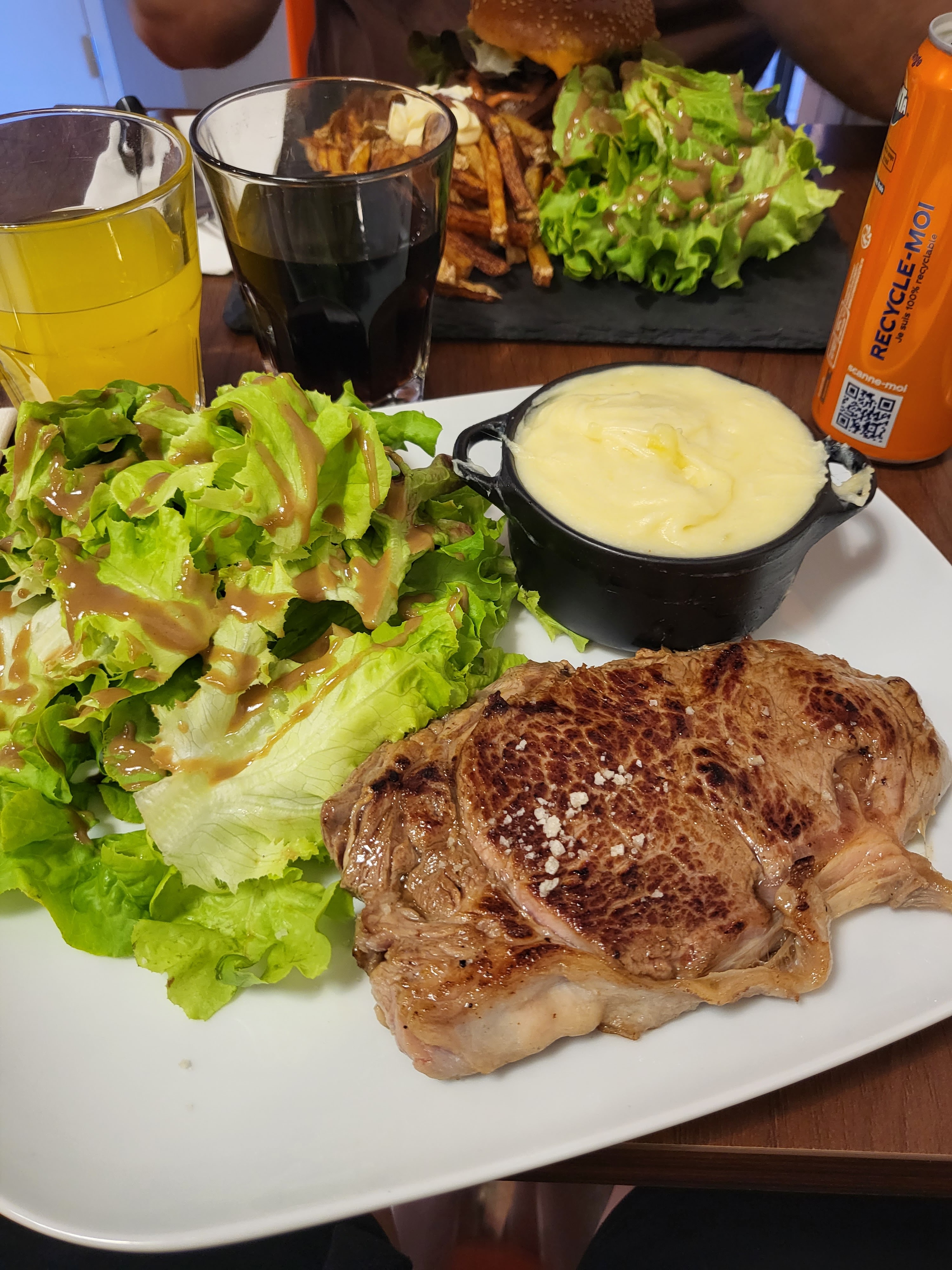 Une vraie côte de boeuf aubrac avec des frites maison succulentes le tout accompagné d'une salade verte agrémentée de tomates. Dessert sorbets remarquable et café garni . Service souriant