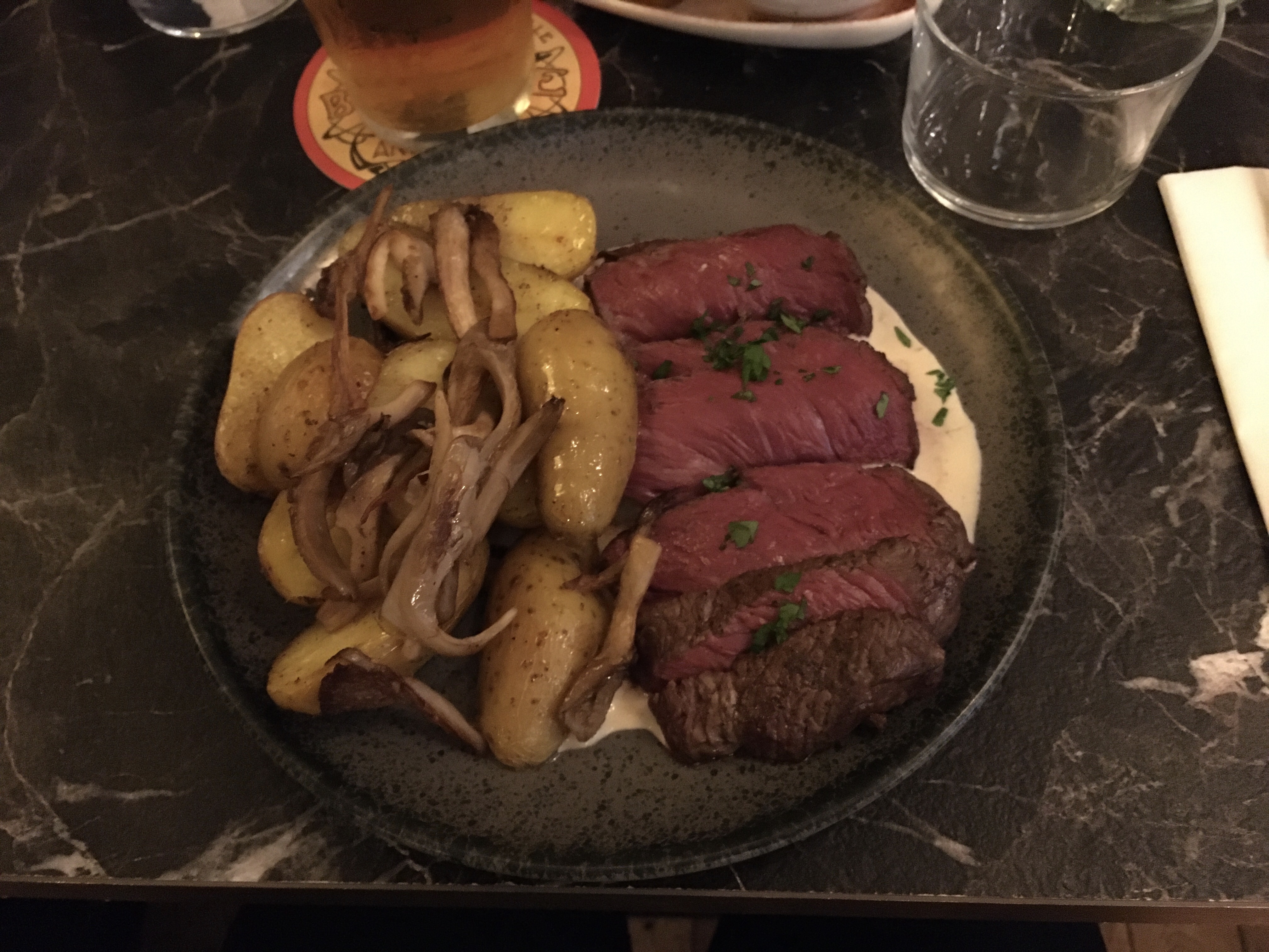 Super bistrot local. Bonne nourriture. J'ai eu l'apéritif poireaux et fromage de chèvre. SUPERBE! Honnêtement, ça vaut tous les euros. Le steak était bon aussi mais avait besoin d'être assaisonné.