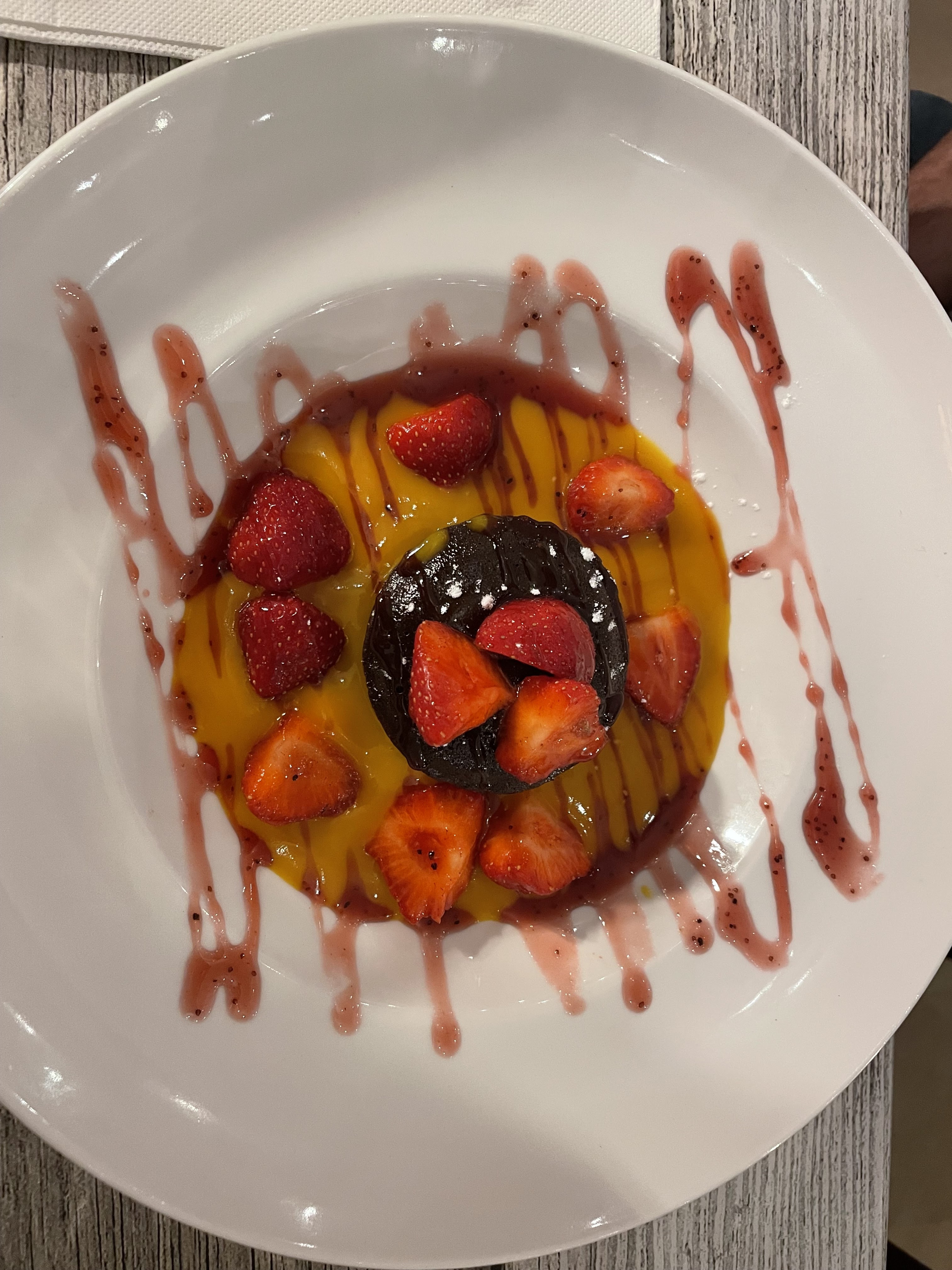 Le service était très sympathique. Nous avons dégusté un risotto crémeux aux crevettes et pétoncles. C'était super sur le pain français. Mon mari et moi avons eu le plat du jour le Tigre qui pleura. Notre steak était cuit parfaitement. La sauce et le riz au jasmin se complètent bien. J'ai ajouté un côté de ratatouille et ça a bien marché. Je recommande vivement cet endroit après une visite du musée Picasso.