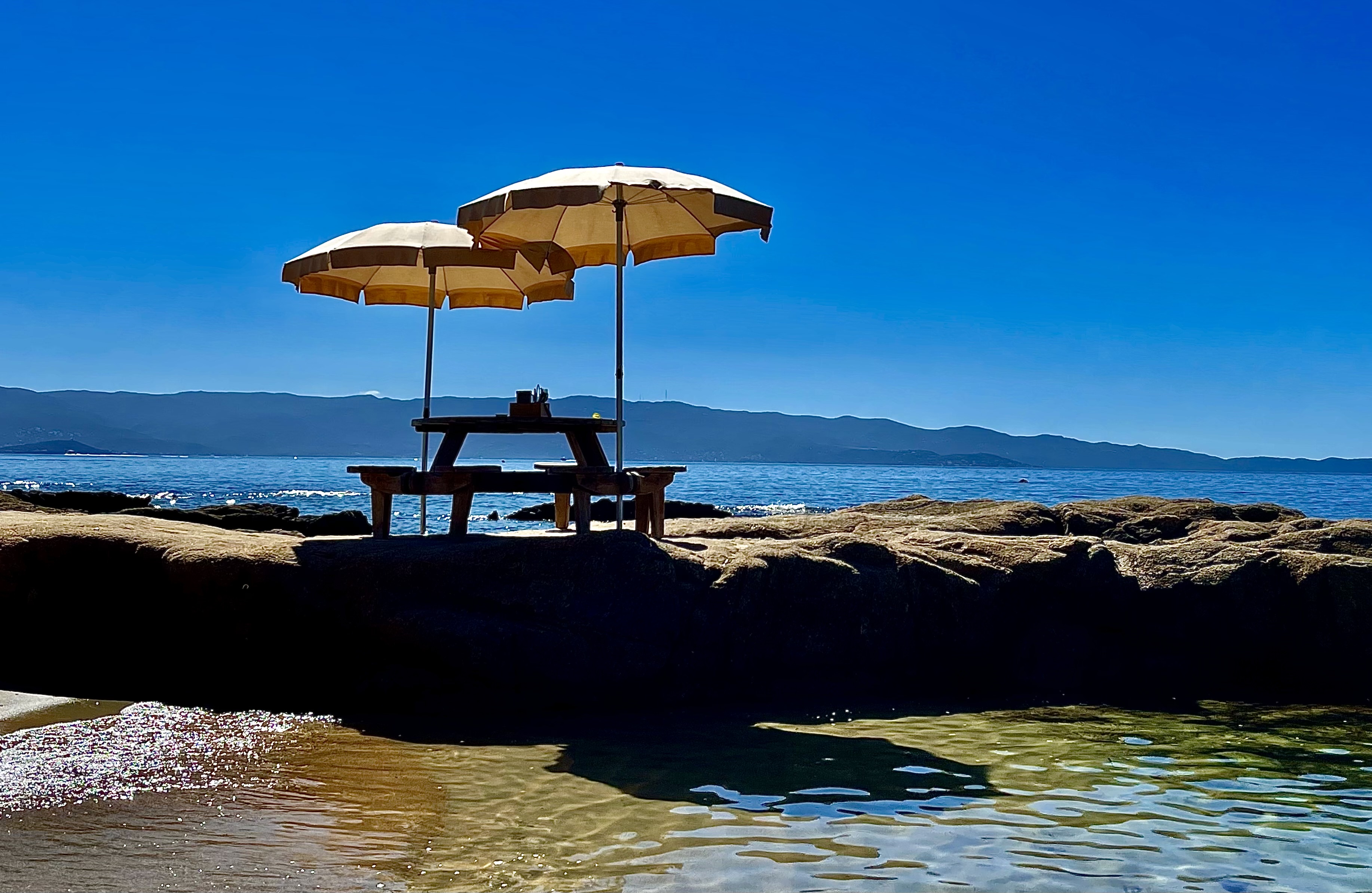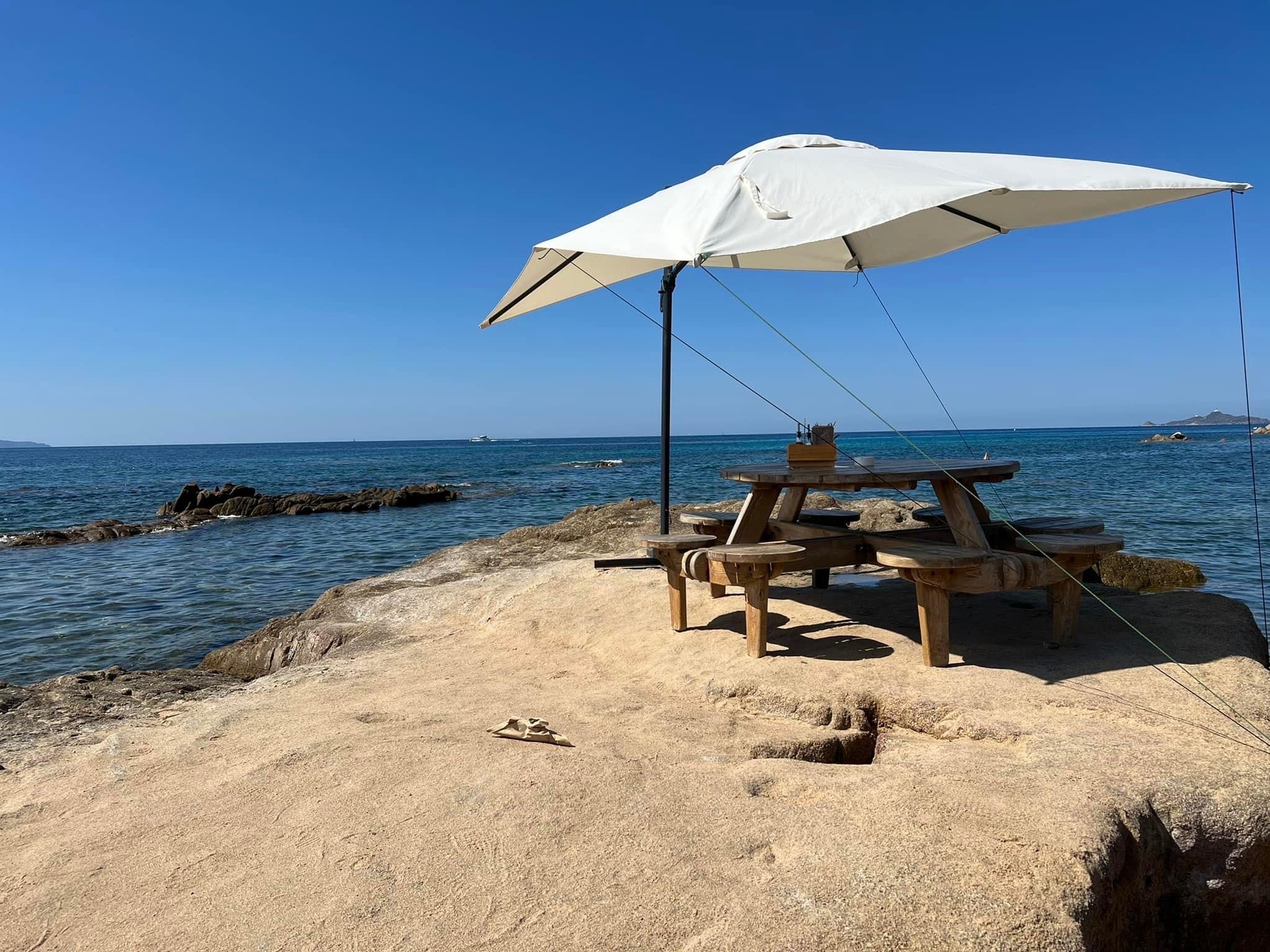 Très bel endroit dans un cadre idyllique au bord de la mer. On peut manger sur des tables installées sur des rochers.Ambiance au top avec Dj Repas avec parillada de poisson très bonne et un rosé Corse succulent. Service impeccable Je recommande cet endroit.