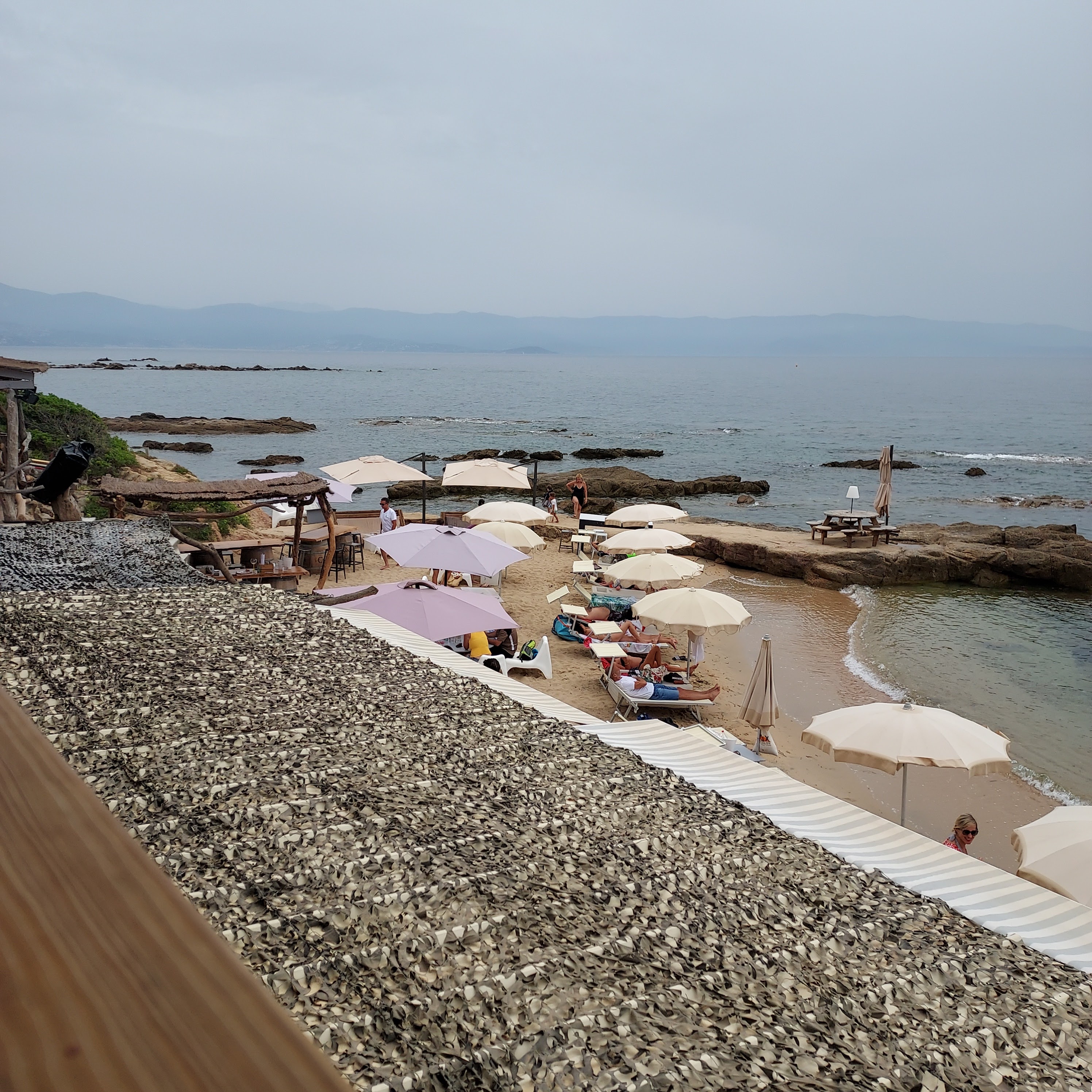 Arrivée le midi, donc tout début de service. Nombreux personnel servant aussi bien dans le restaurant principal que sur les diverses terrasses en contre-bas. Belle vue sur les Sanguinaires. Assiettes copieuses. Immense parking au dessus de la paillote. Pas d'accès handicapé.