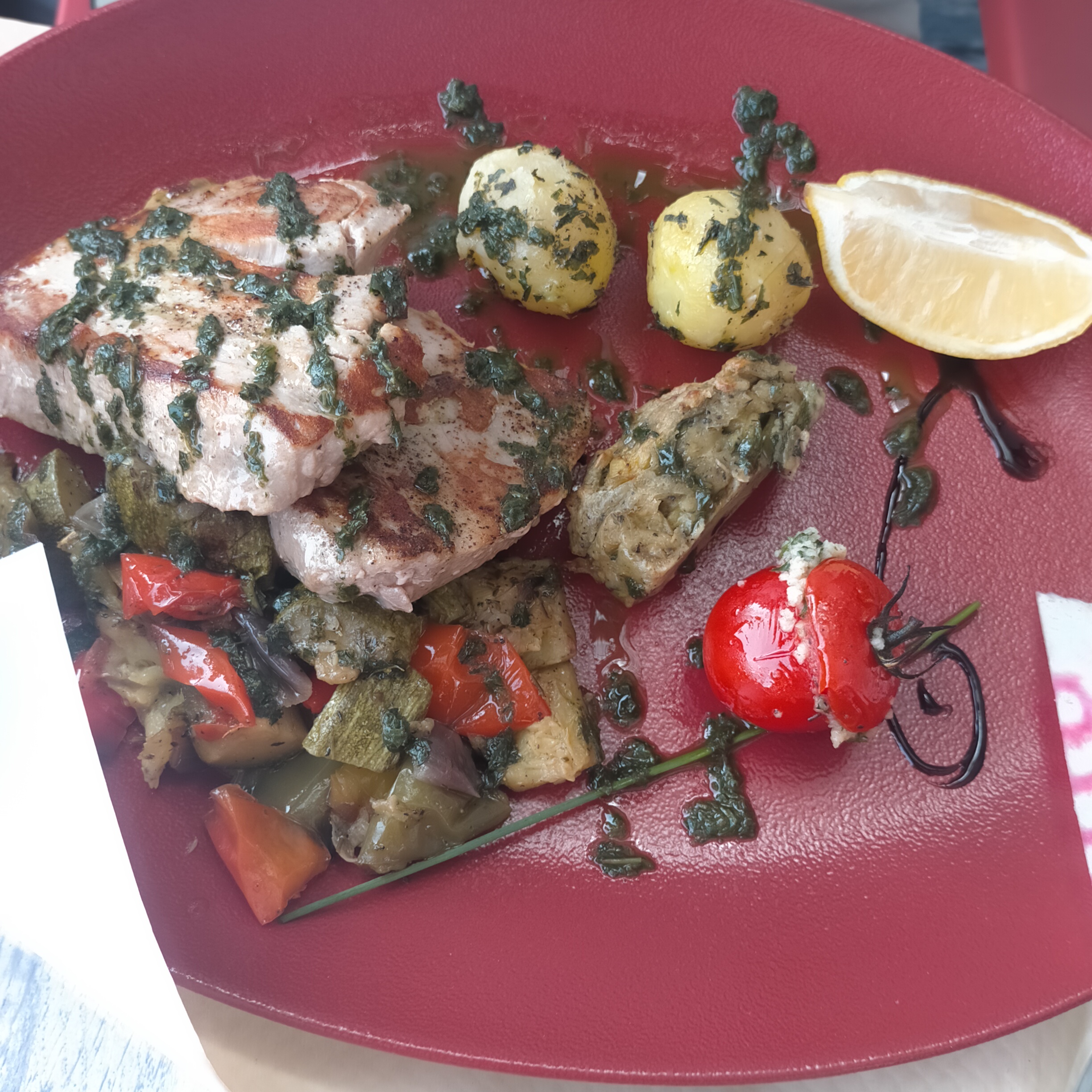 Un pur régal le steak de thon au top cuisson impeccable et légumes délicieux moi j'ai pris le tartare de saumon parfait pareil un pur délice