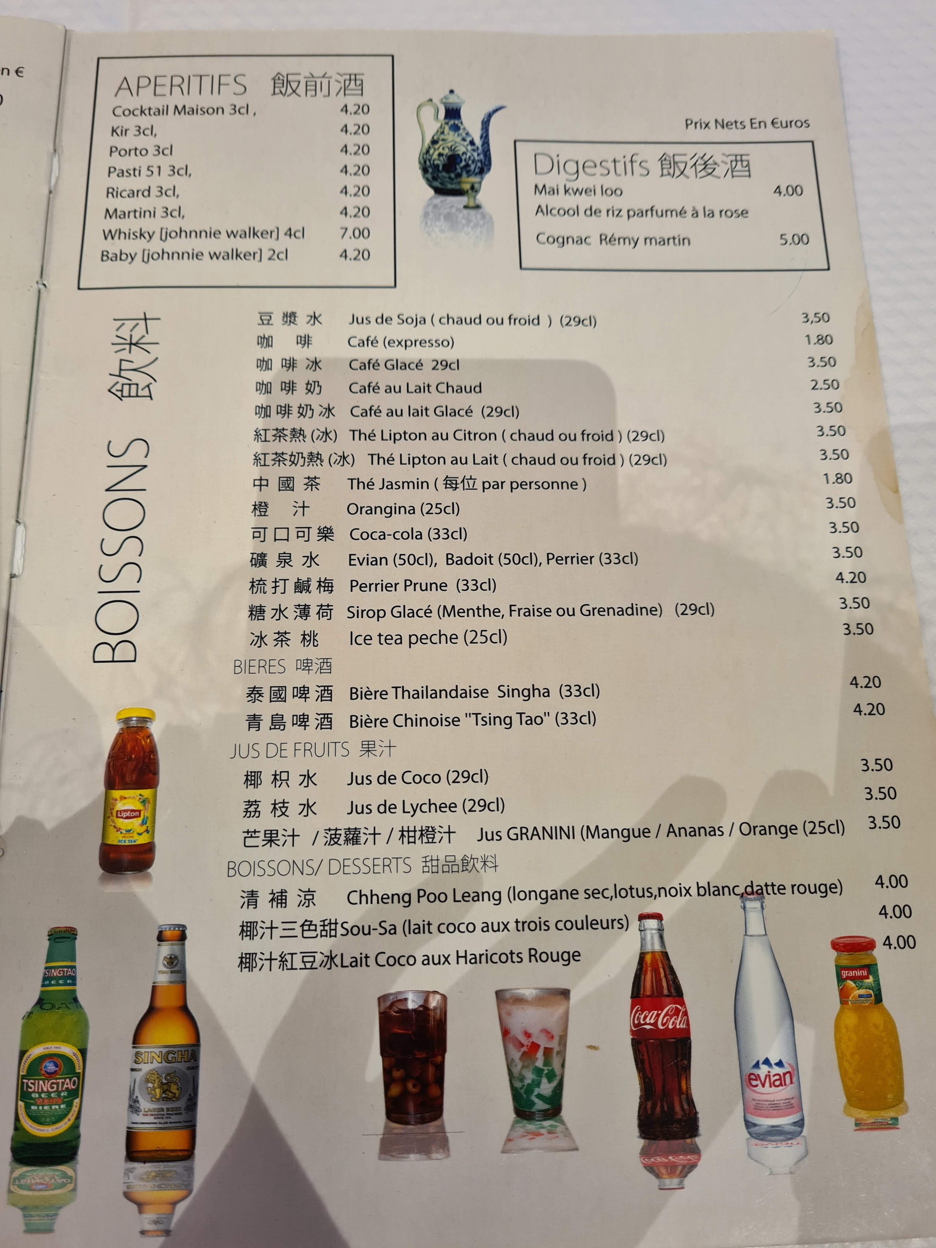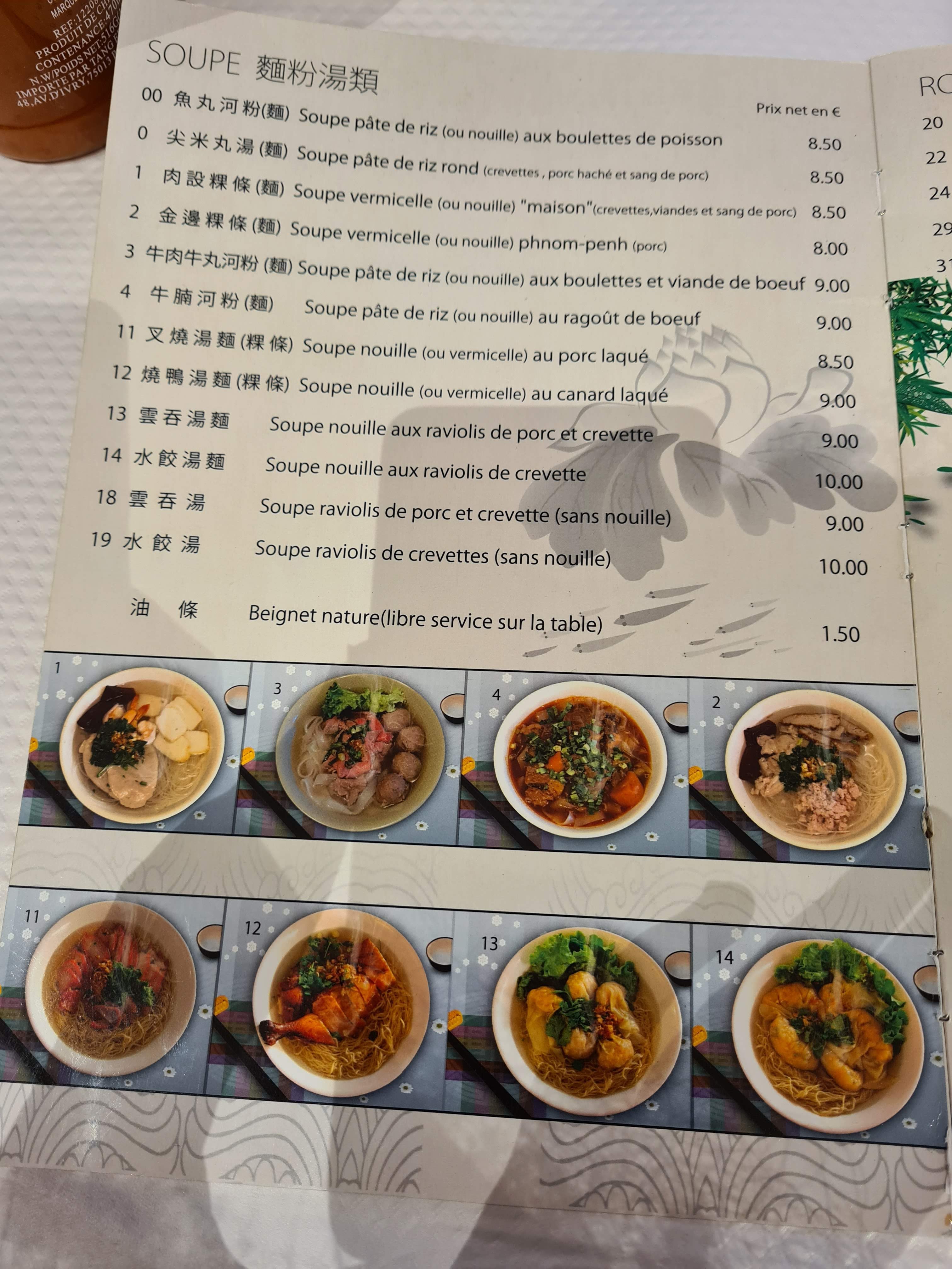 Beaucoup de choix sur la carte. Un mélange de spécialités chinoises, vietnamiennes...grande salle avec beaucoup de tables. Possibilité de prendre un bon bouillon bien chaud pour le petit déjeuner.