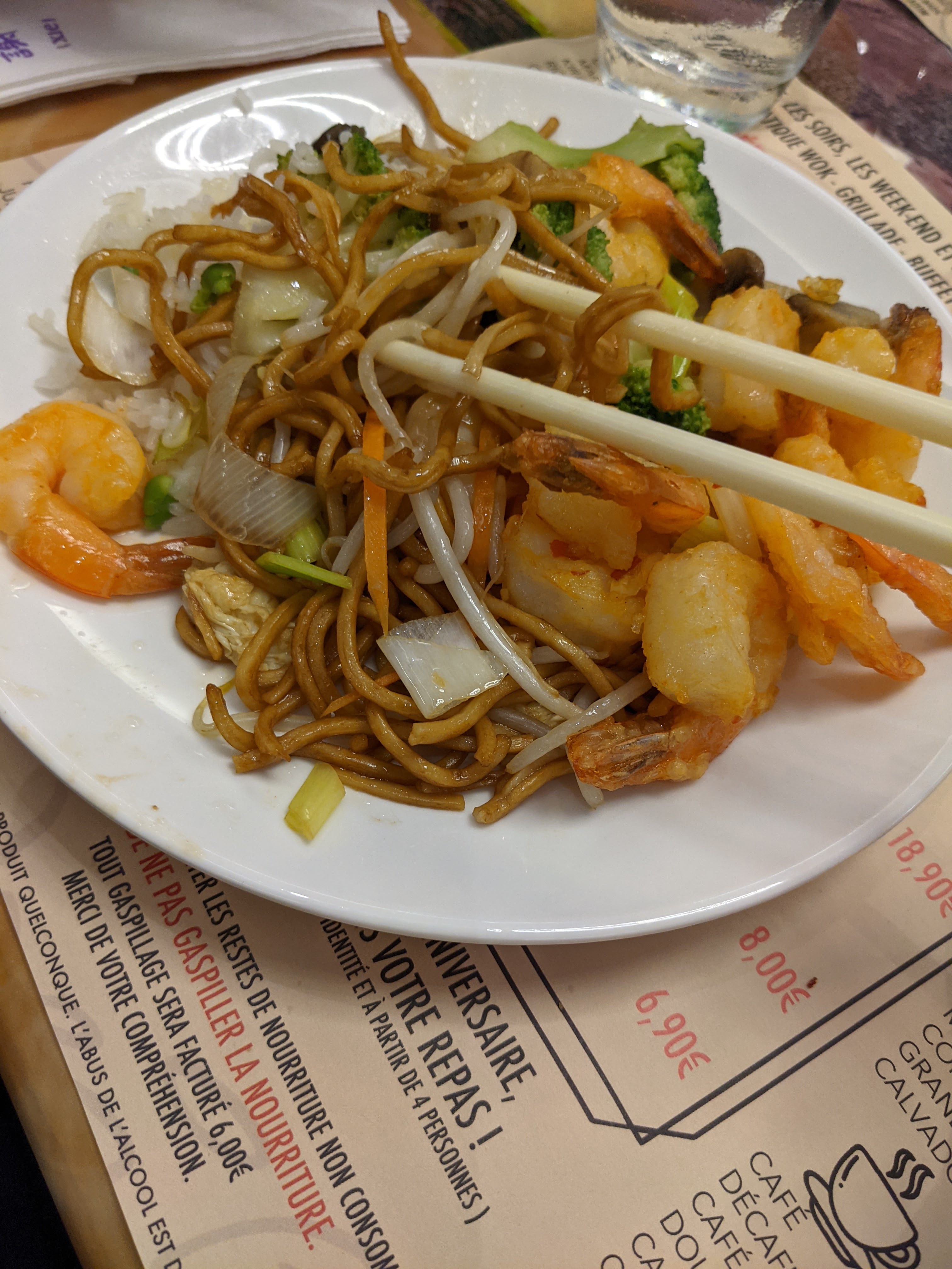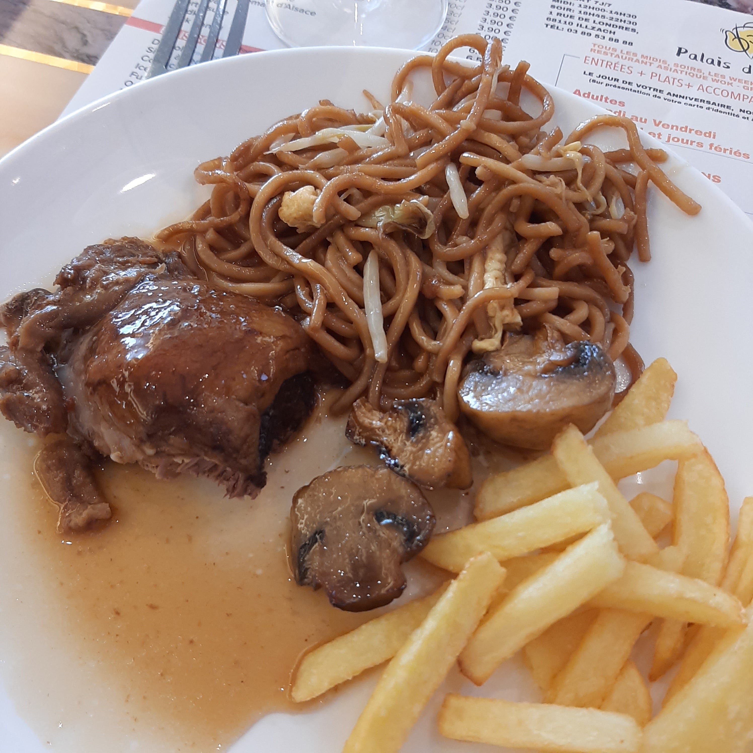 Décevant, Les frites les plus fades de ma vie et je n'ai même pas reussi a savoir si elle était cuite, peut-être qu'un stage chez mcdo ne serait pas de trop. Les nuggets n'ont aucune saveur et ça, faut le faire quand même. Les nems au poulet n'ont pas plus de goût et tout ce qui peux être mangeable reste le samoussa au boeuf même s'il est aussi caoutchouteu qu'une semelle orthopédique. Les nouilles aux légumes ? Ne cherchez pas, ce n'est pas dans ce restaurant que vous en mangerez des bonnes . Certes il y a du choix, mais dans ce cas la il faudrait ajouter '' fourre tout alimentaire '' sur la façade. Ça ne vaux certainement pas 14€, pour le même prix on mange mieux au buffalo.