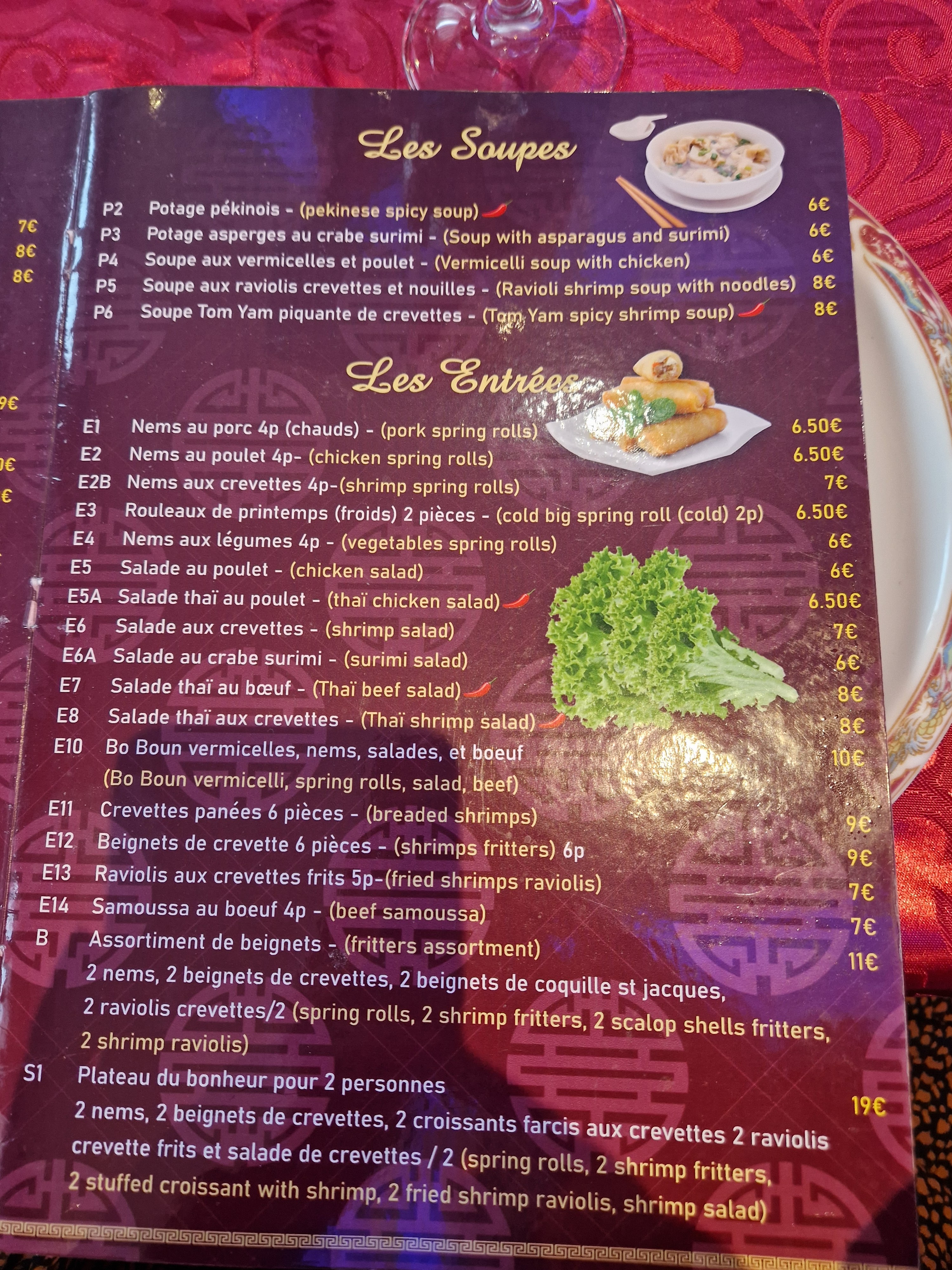 Très grande carte chinoise thaïlandaise et Vietnamienne je dirais 1 très bon endroit pour passer un moment agréable portion généreuse et bonne personnels très sympa et souriants petit hic le manque de pain pour moi français pour saucer sinon👍👍👍