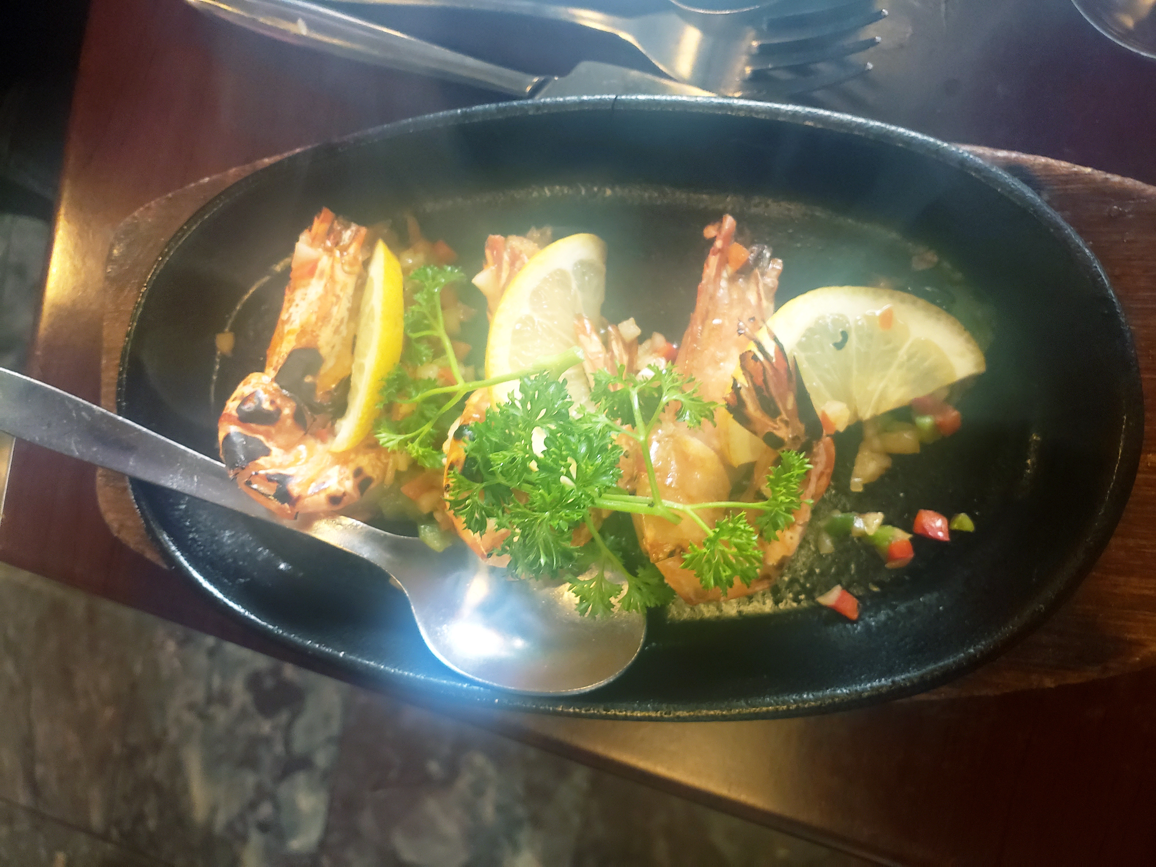 Ambiance froide. 3 Gambas pour 15€ avec du riz non compris pour 4€ ! Ça fait cher la bouchée. Ma collègue a pris du poulet goût special😂mais apparemment plat incipide. Force à la consommation. Pour ma part je ne recommande pas ce restaurant.