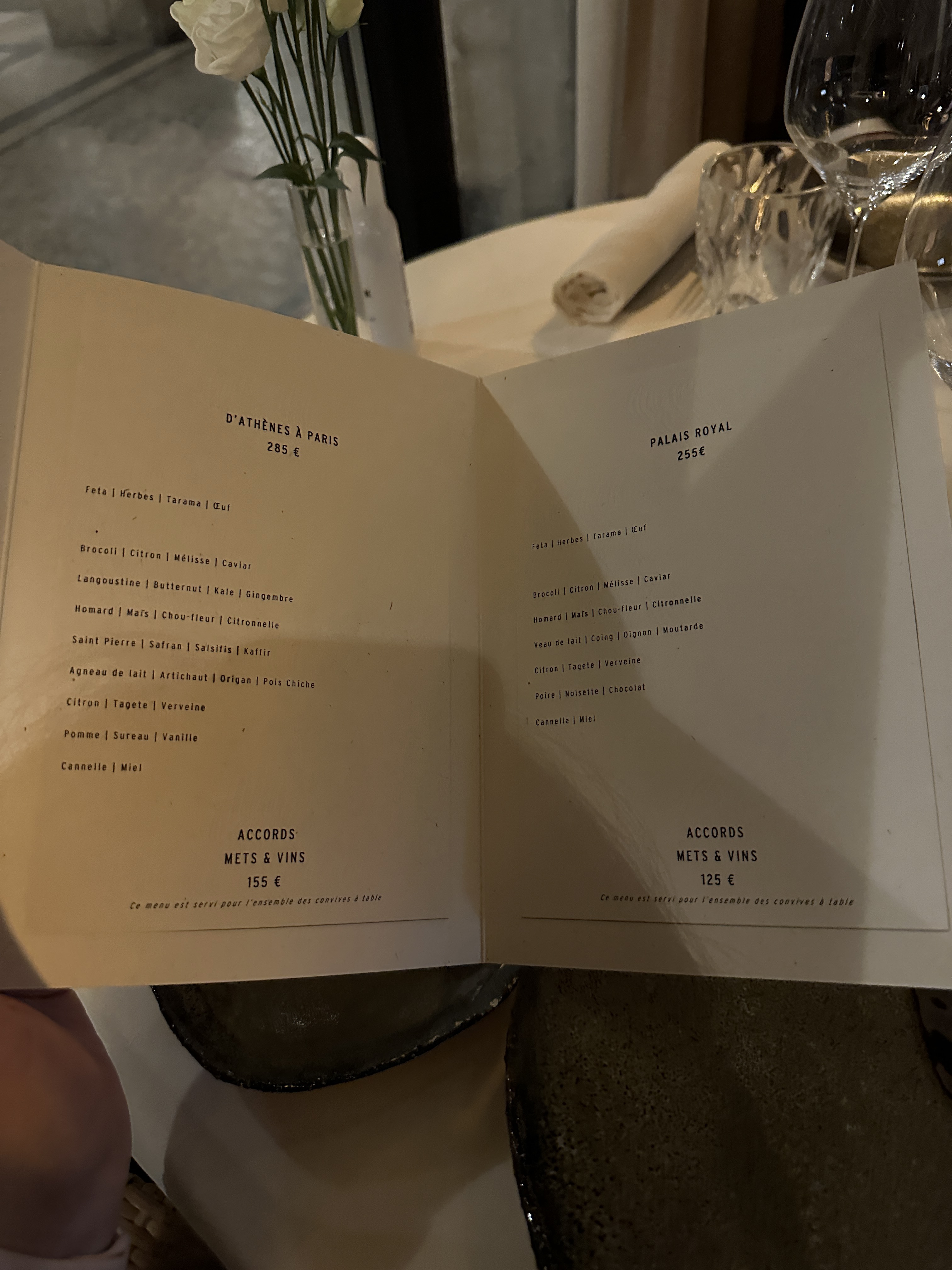 Le menu d’Athènes à Paris est excellent avec l’accord mets et vins . Le chef y associe ses origines grecques à des produits de qualité avec subtilité. On a passé un très bon moment !