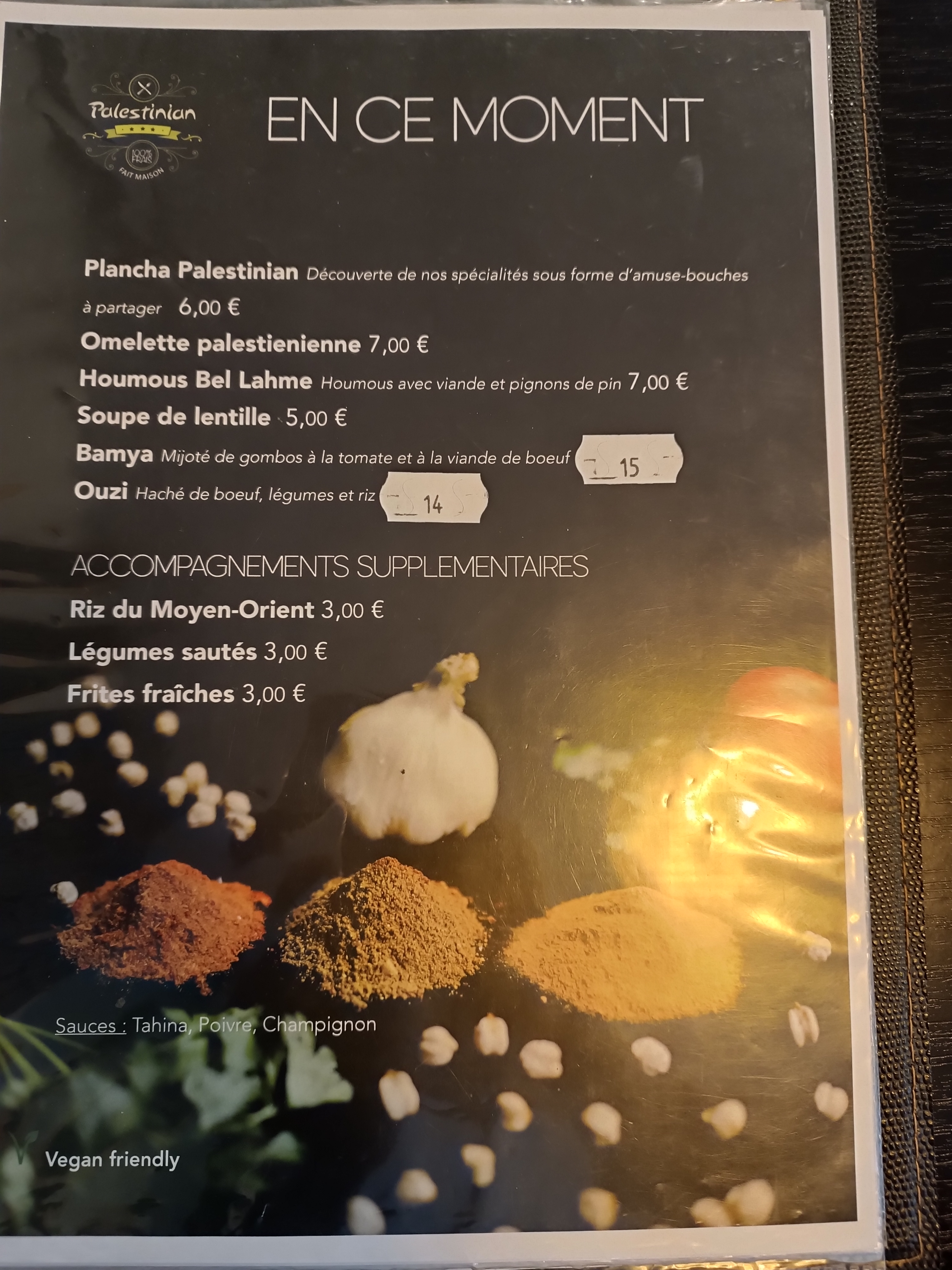 Accueil super chaleureux,bonne équipe, bonne ambiance niveaux plat,super bon jamais déçus. Contrairement à se que les gens disent il n’y a pas de frite à la carte. Je mange tout les jours là-bas et je ne suis jamais déçus, je découvre les plats palestiniens,le makloubé je ne connaissais pas et c’est un délice .