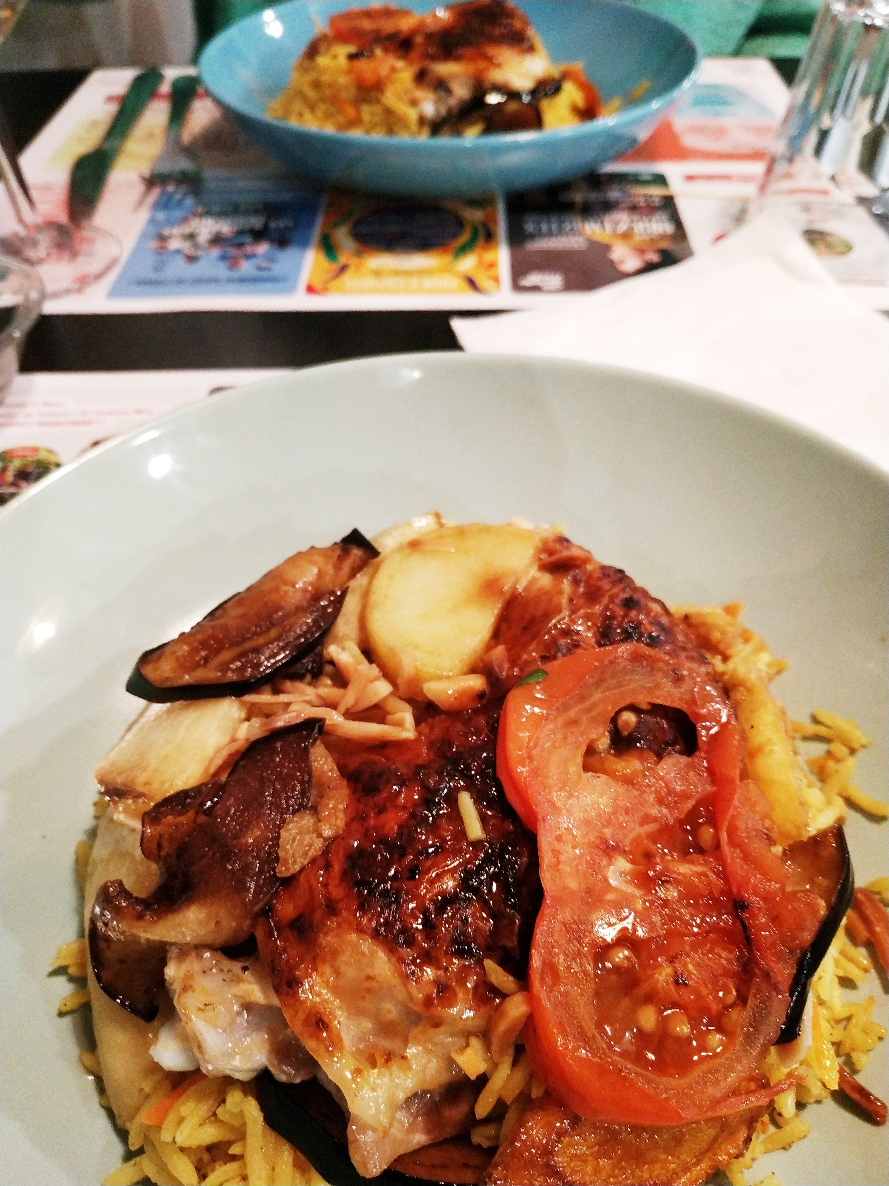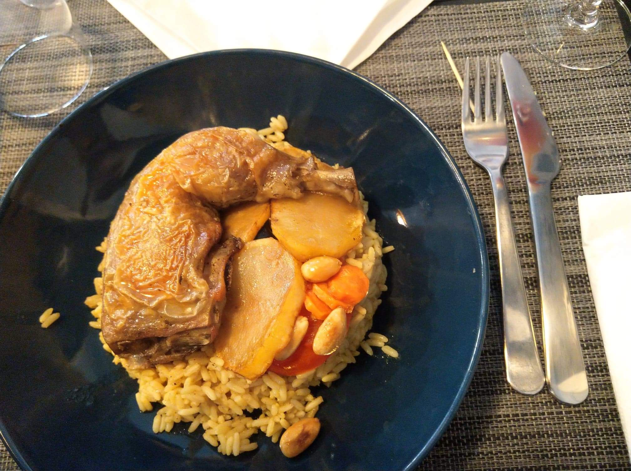 Entrée : Toast de falafel, toast sauce yaourt thym, toast caviar d'aubergine 😋, toast houmous. Plat:Très bon gigot cuit je l'ai demandé. Riz safrané parfumé, légumes croquants. Dessert : pâte filo aux pistaches (les 2 cigares en croix)