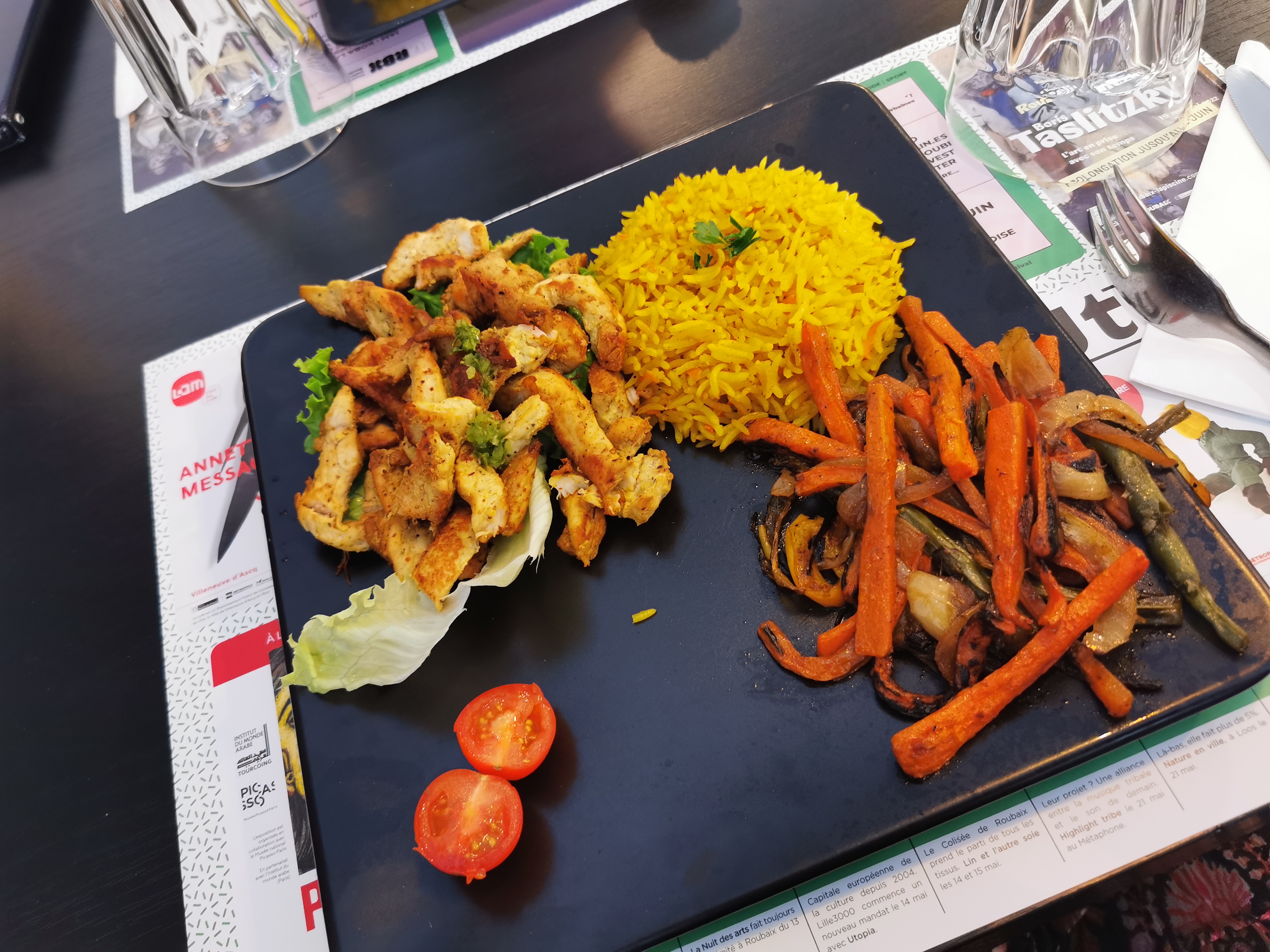 Non non non et non. Le riz epice est délicieux mais est ce une raison pour le servir avec tous les plats??? Les falafels sont pas mauvaises certes mais on est dans un resto où un kebab??? En plus falafels et riz c est sec et servi avec un petit pot de sauce tellement ridicule! Tout aussi ridicule que la soit disant brochette de légumes qui l accompagné! Bref bien Déçue! Et je vous parle pas de l amertume quand arrive l addition car franchement c est un peu cher pour ce que j ai mangé, ça vaut pas ! Les 3 personnes qui m accompagnaient même avis que moi.