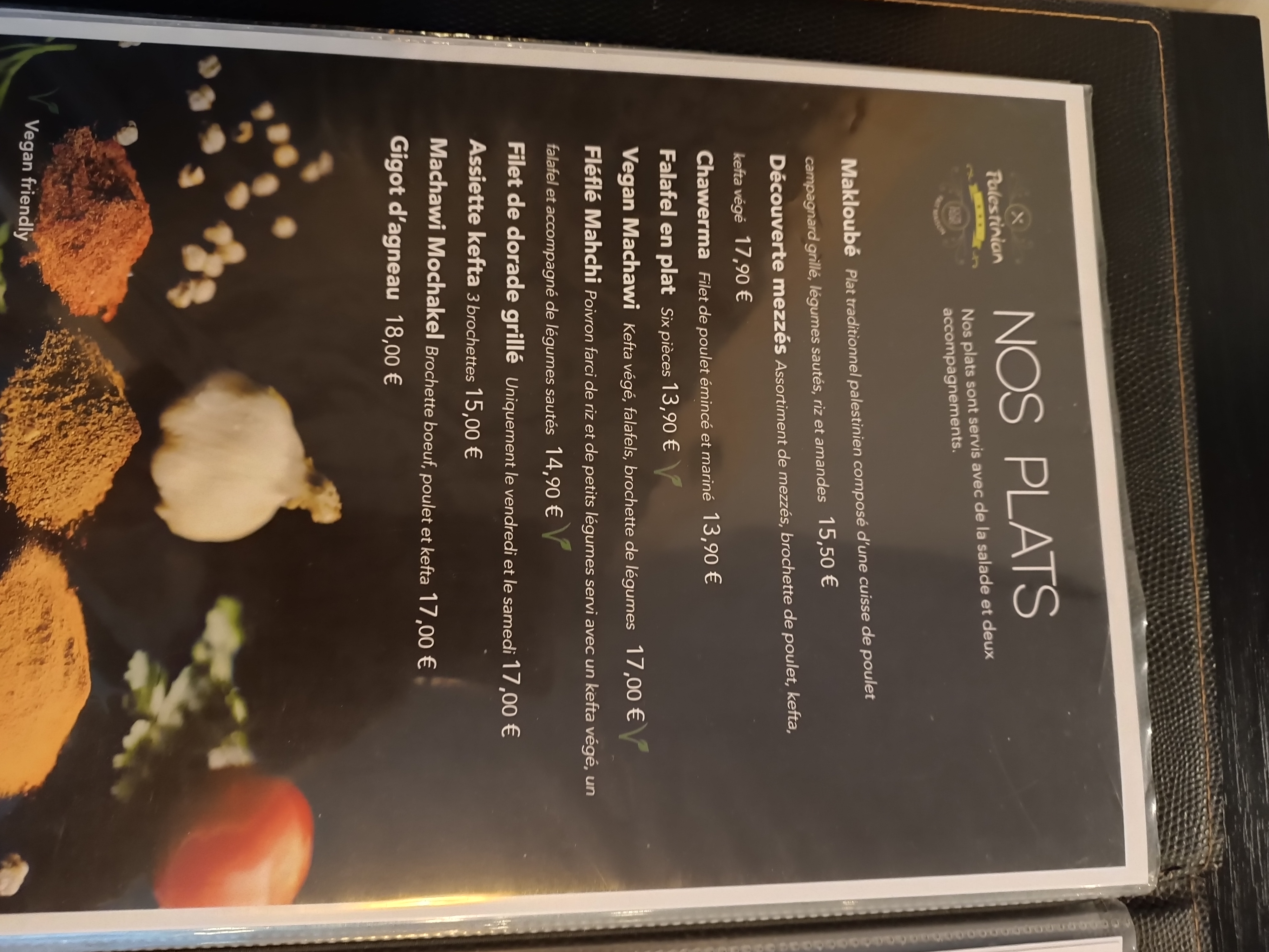 Excellent plats. Originaux, excellent rapport qualité prix qui nous font découvrir La Palestine. Je recommande moi et ma femme .