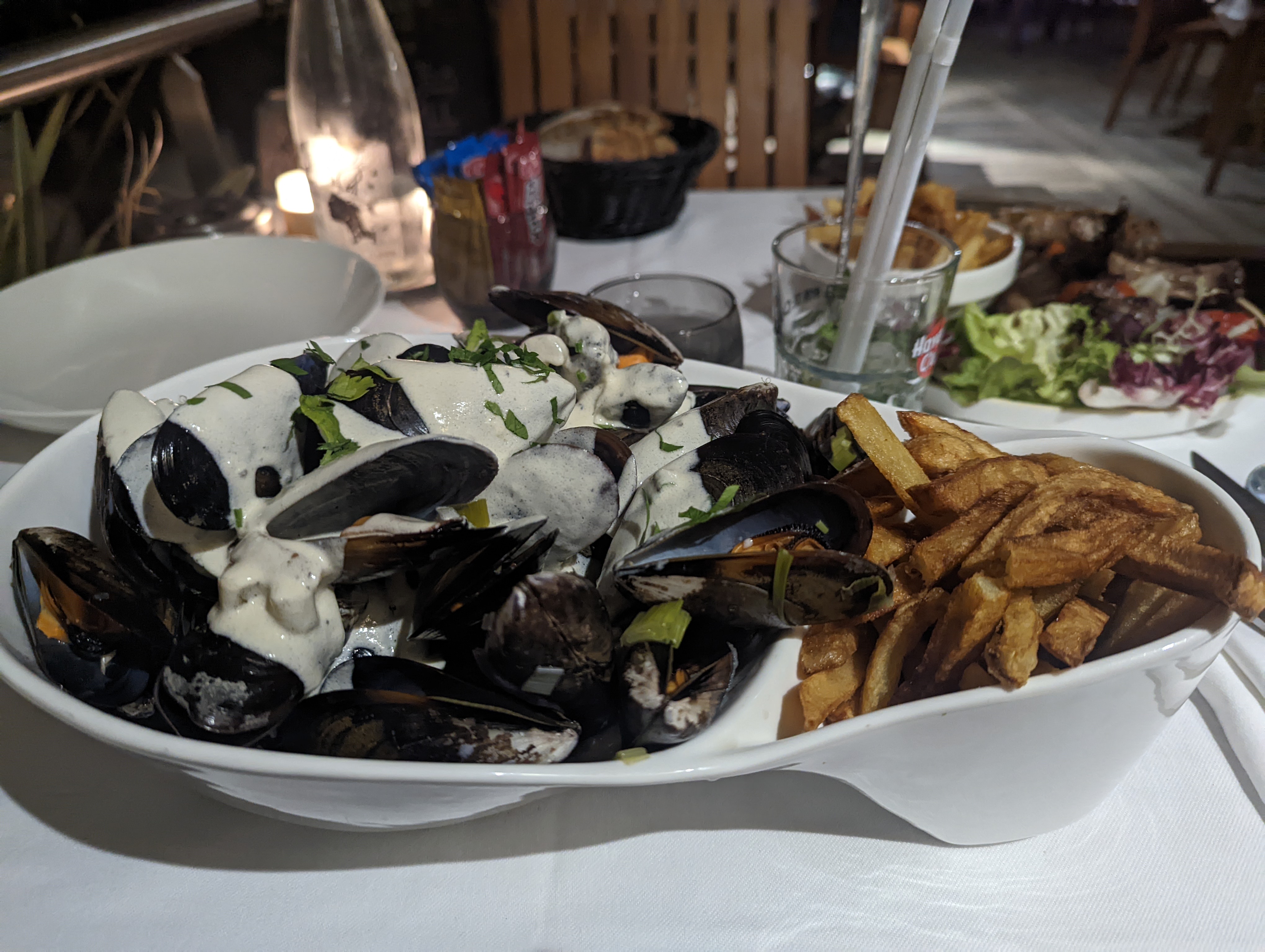 Moules frites très bonnes Personnel sympathique Manger les pieds dans le sable face à la mer : génial !