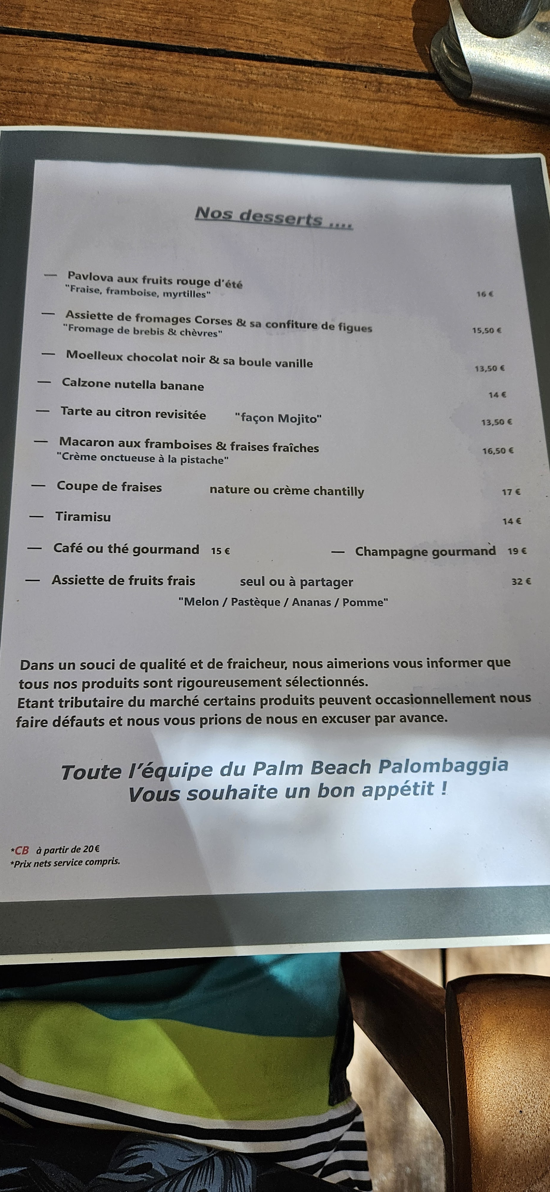 Nous avons passé un super moment au Palm Beach, manger au bord de la plage de Palombaggia les pieds dans le sable ! Le repas était délicieux (le cocktail du jour également ), l’accueil et le service parfait ! Un grand merci !! Nous reviendrons avec plaisir !