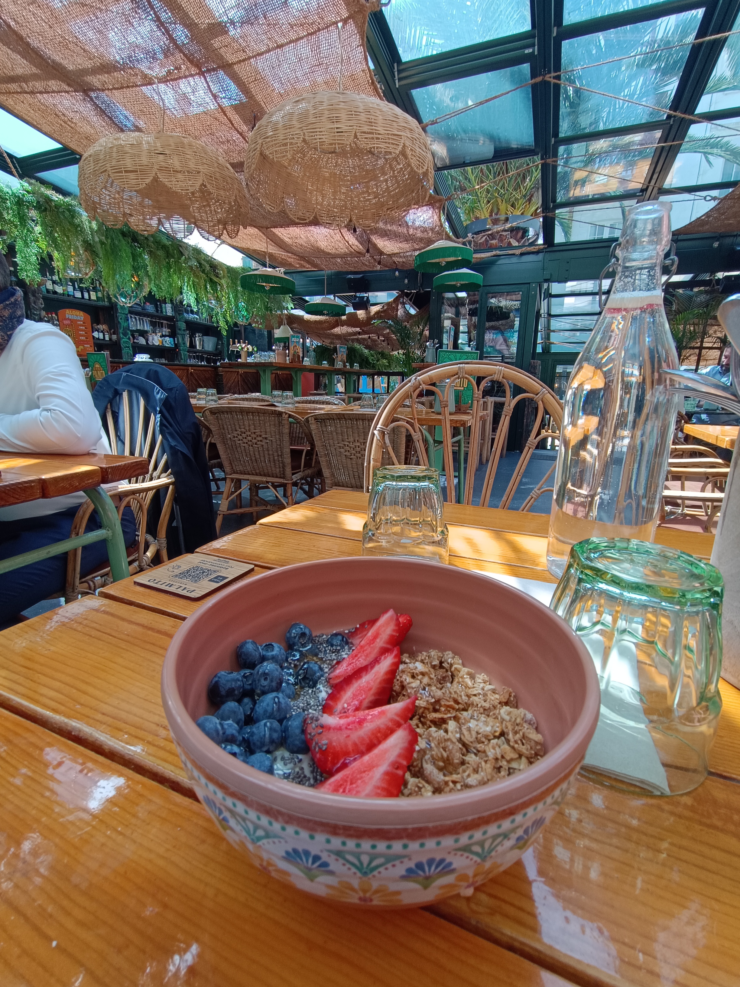 Ambiance sensationnelle, entre tables en bois, végétation (imitation) abondante, musique chill house, serveurs souriants et à votre service, j’ai adoré !! Le brunch est simple mais de qualité. Et pour finir sur la note nature et relaxante, vous devrez partager votre doux repas avec une colonie fort sympathique de moineaux. Attention toutefois ce dernier point en gênera certains…