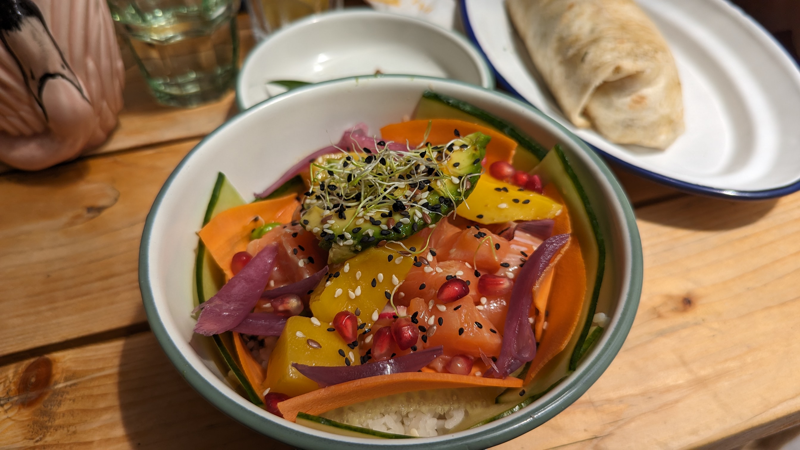 Un concept vraiment sympa : plusieurs types de nourriture / boisson en une seule commande ! 👌 Les produits sont frais et les plats suffisamment copieux 🌯🥙 La musique d'ambiance correspond parfaitement au lieu, et pas trop forte ! 🎶 Les tikis sont également très bons ! 🍹