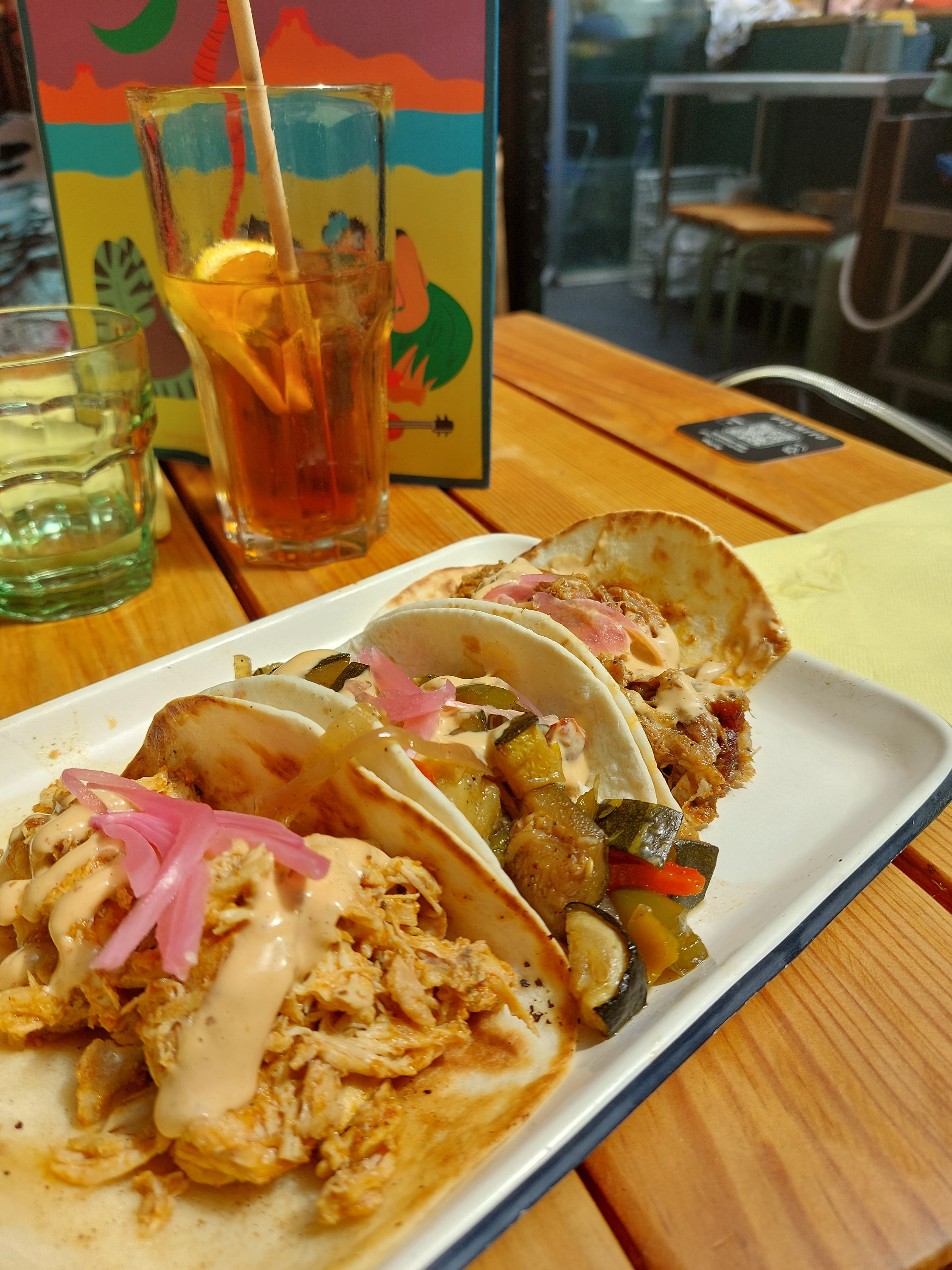 Dommage pour les tacos qui baignaient dans l’huile… car le goût y était mais là c’était trop.. et bénéfice du doute pour les verres pas super propres… Serveurs sympas. Ambiance oui aussi mais musique un peu forte.