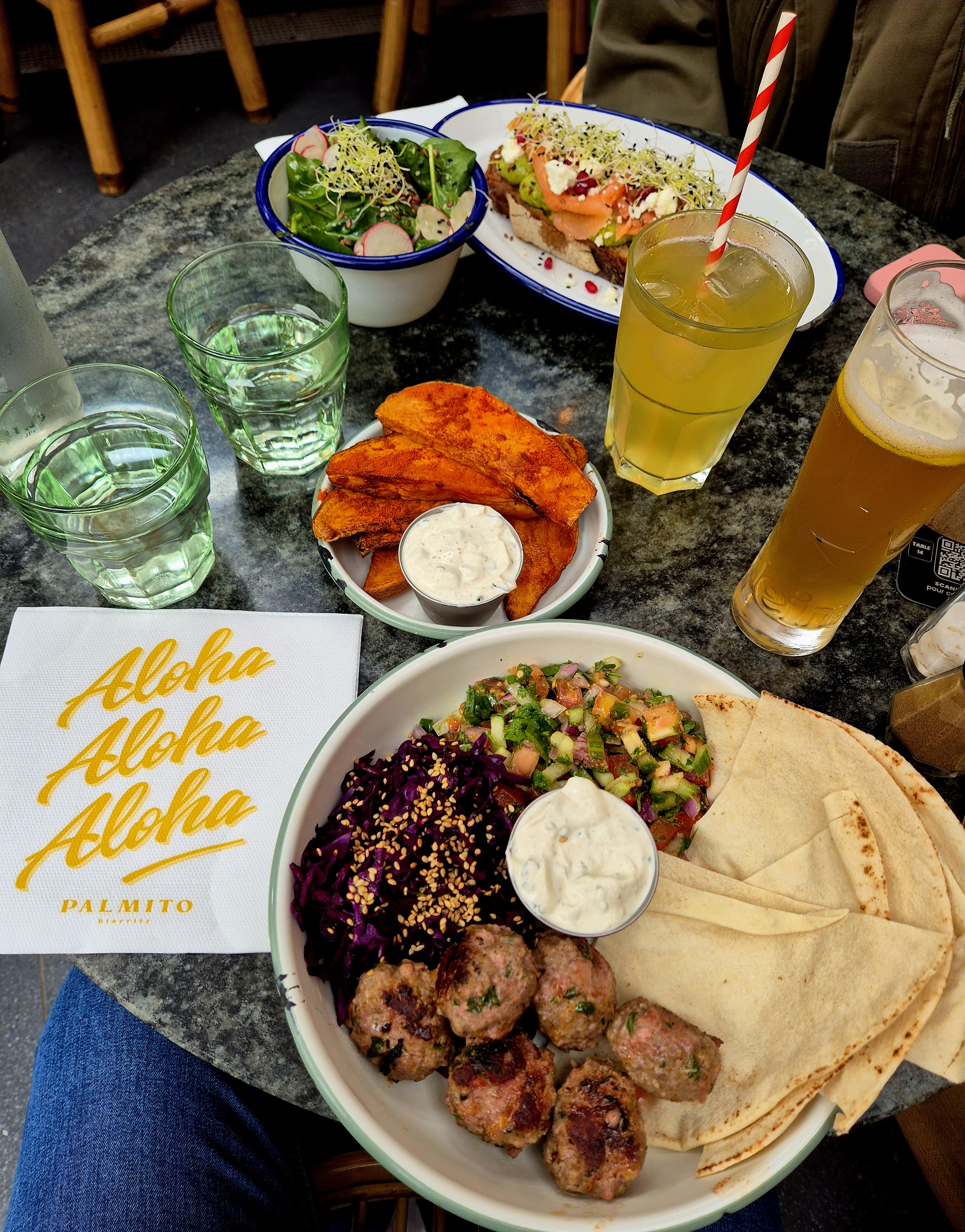 En vacances pour une semaine à Biarritz nous avons découvert par hasard ce restaurant. Nous y avons mangé à deux reprises : un soir et un midi. Le service est continu ce qui est très pratique. Nous avons adoré ce restaurant. Nous avons tout particulièrement aimé le houmous et les pancakes salés au saumon & à l'avocat. Nous reviendrons. Seul petit bémol : la musique est un peu forte + les oiseaux sont très mignons mais font leurs besoins un peu partout.
